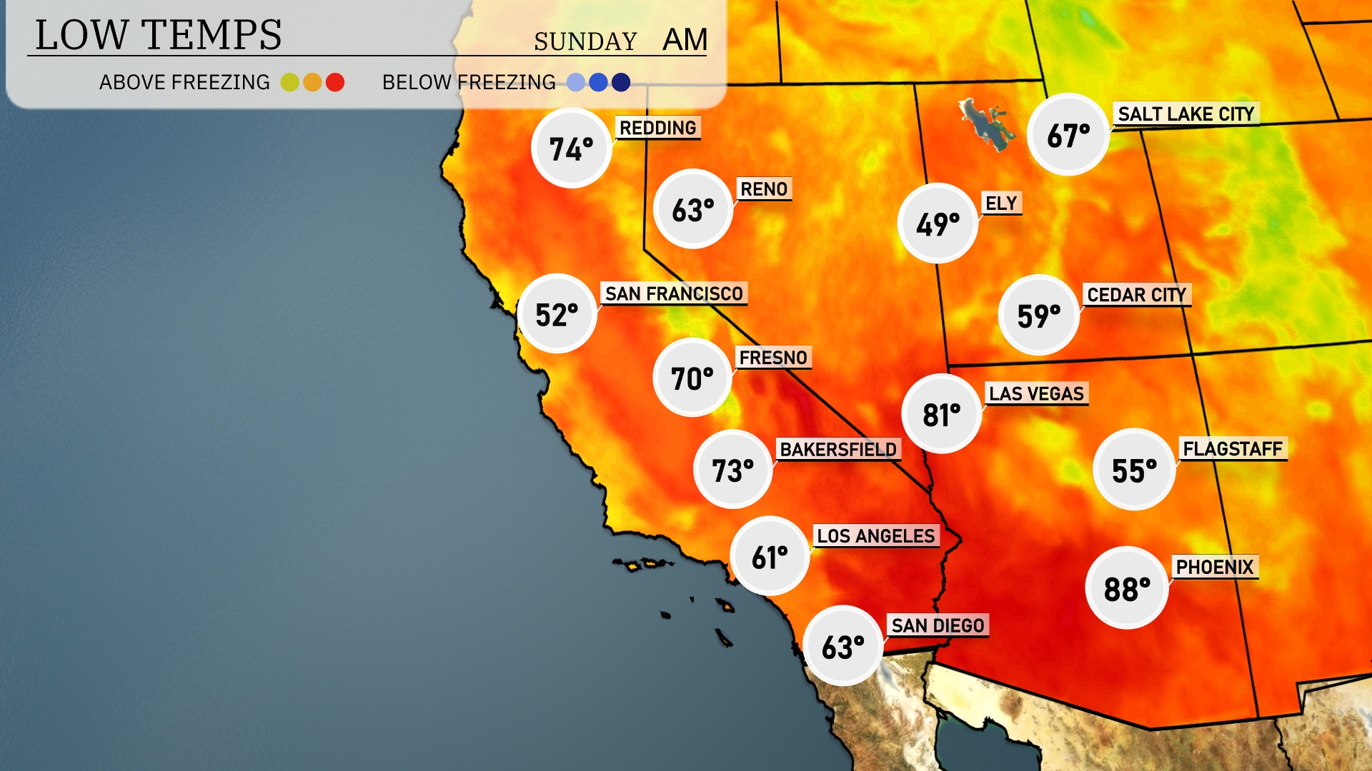 Tonight, San Francisco will drop to a chilly 52 degrees, while Bakersfield sees a low of 73. In stark contrast, Las Vegas will remain warm with a low of 81. Flagstaff is expected to cool significantly to 55 degrees, and Ely is forecasted to dip to a brisk 49 degrees.