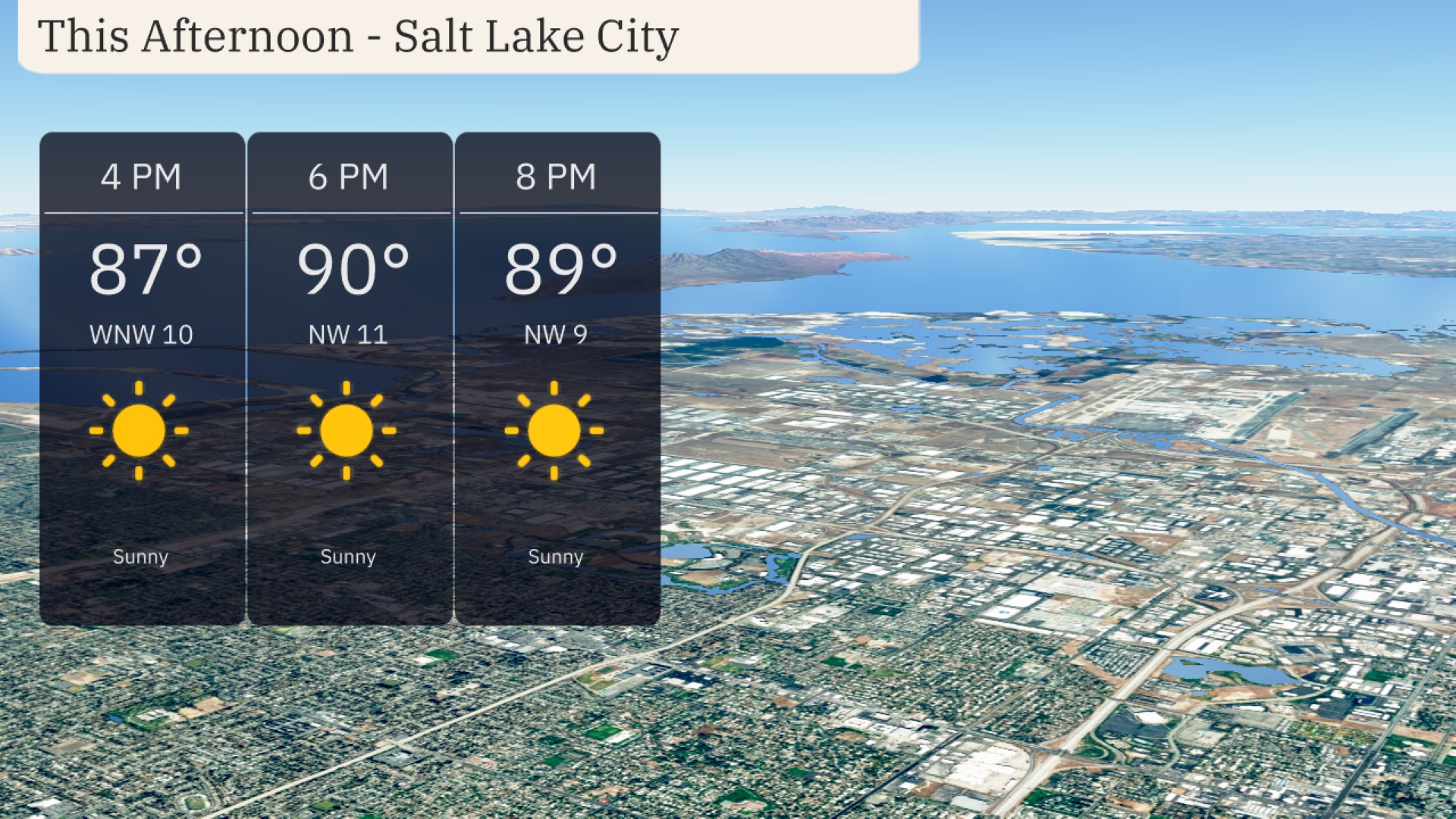 Salt Lake City this afternoon will bring sunny skies with temperatures gradually rising from 87 degrees at 4 PM to 90 degrees by 6 PM. Winds will be from the northwest, ranging between 10 to 11 miles per hour. By 8 PM, temperatures will slightly dip to 89 degrees, maintaining clear and pleasant conditions.