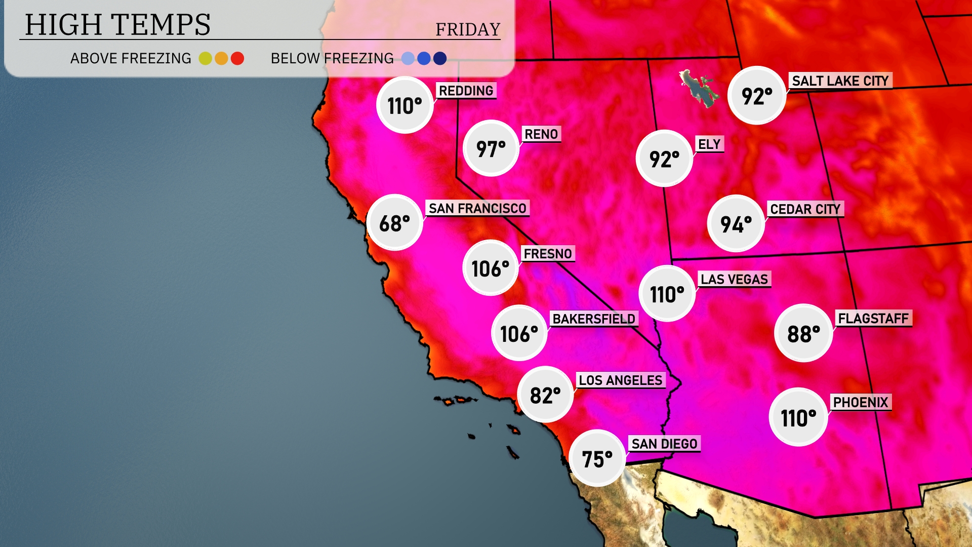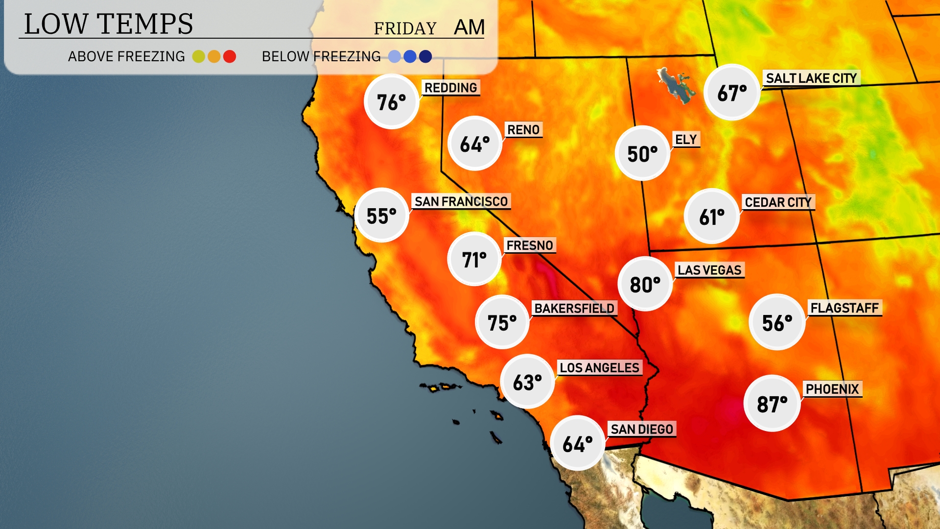 Tonight, Las Vegas will dip to 80 degrees, while Flagstaff is looking at a cooler 56 degrees. In San Francisco, expect a low of 55, and Los Angeles will see temperatures fall to 63 degrees. Meanwhile, Bakersfield will remain warmer at 75 degrees, staying relatively mild across the region.