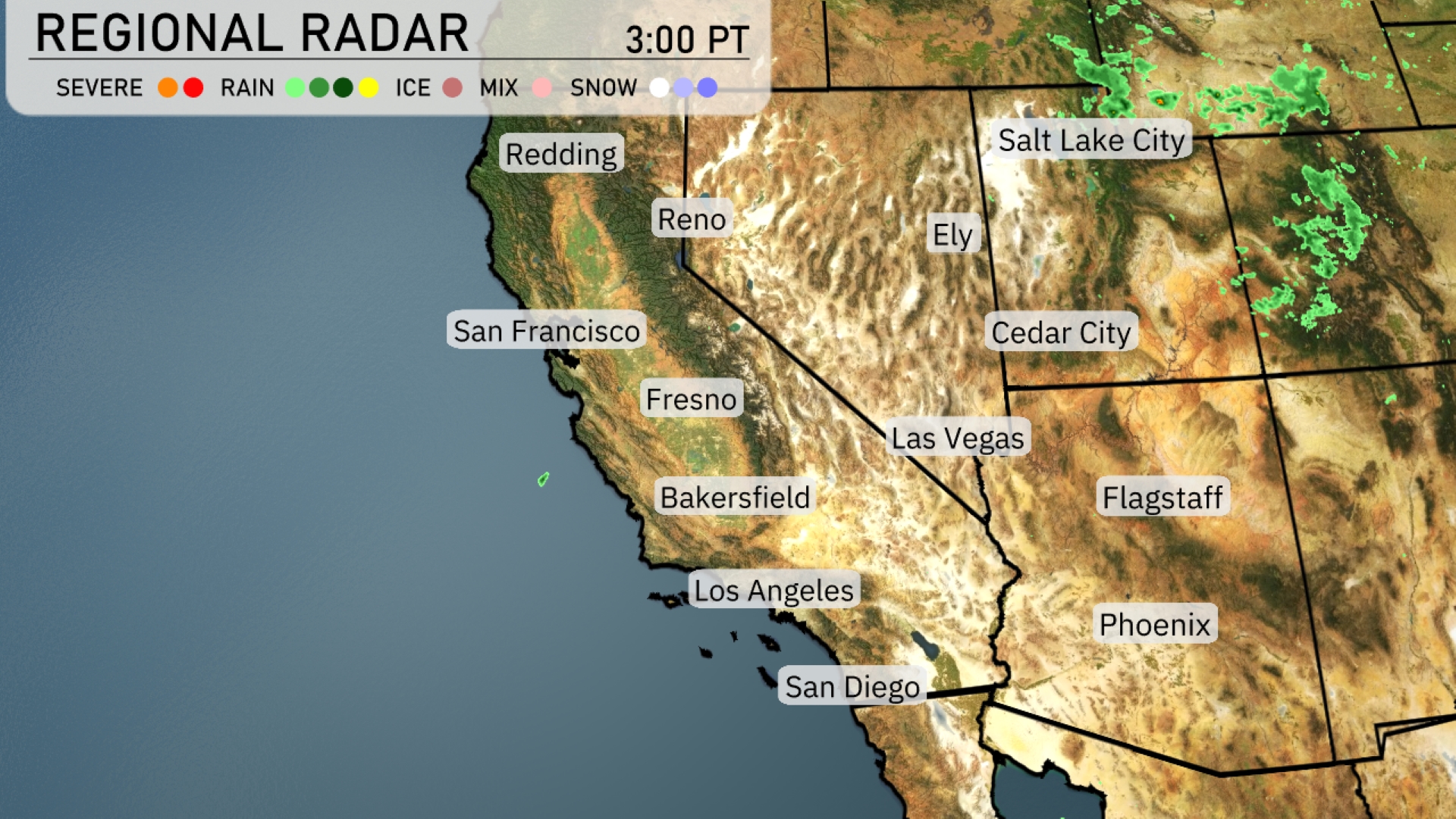 It’s a mostly calm scene across the Southwest, with clear skies prevailing from Phoenix to San Diego. Up near Ely, a few scattered clouds are lining the sky. The Four Corners region shows some light precipitation forming, not too impactful at this hour. Those in Salt Lake City may notice increasing cloud cover moving in from due north, but conditions remain dry for now.