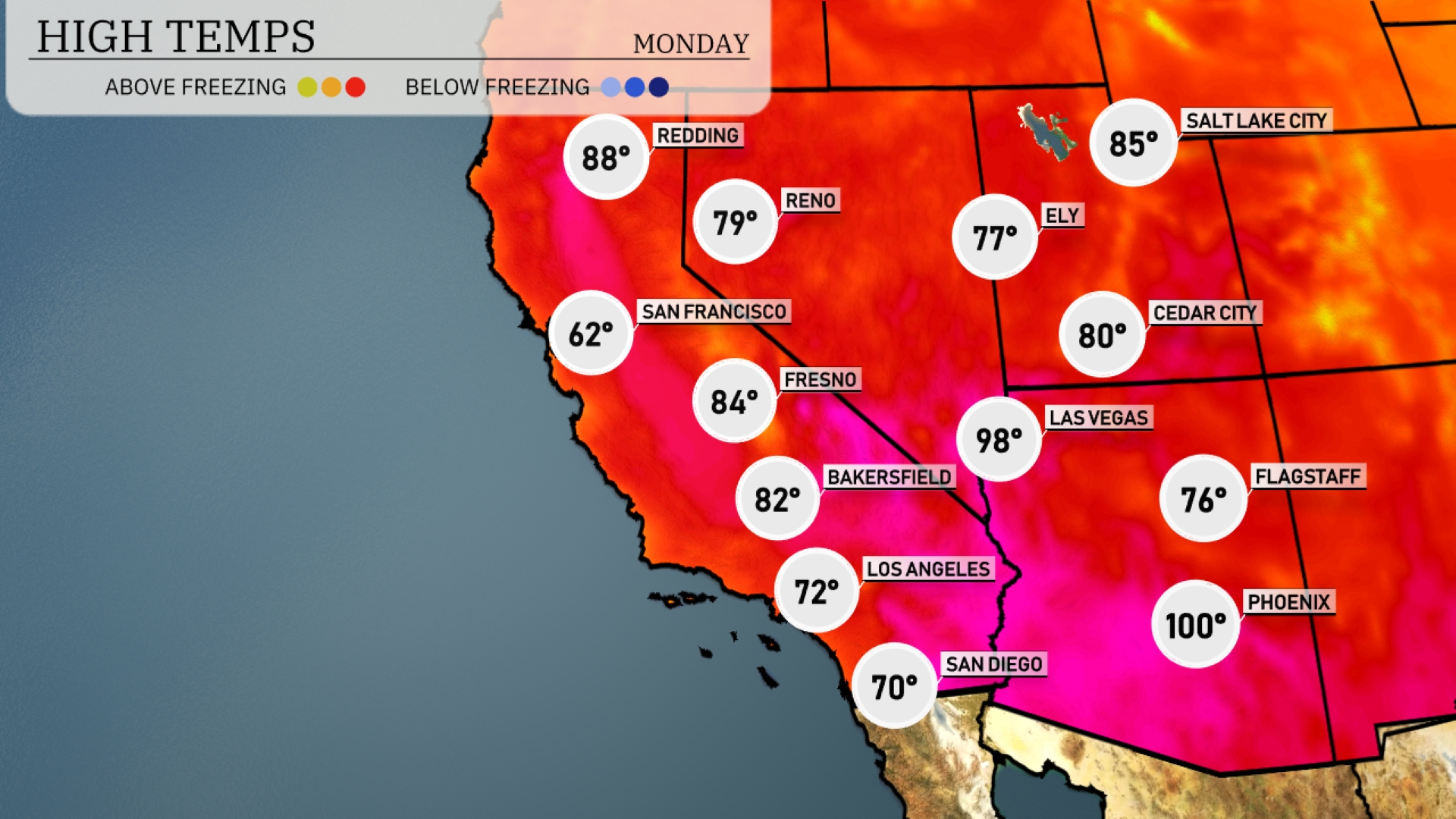 Tomorrow Phoenix will soar to a scorching 100 degrees, while Las Vegas is expected to reach 98 degrees. Los Angeles will experience a mild 72 degrees, and San Diego remains cooler at 70 degrees. Up north, San Francisco will see a high of just 62 degrees, contrasting sharply with the warmer inland cities.