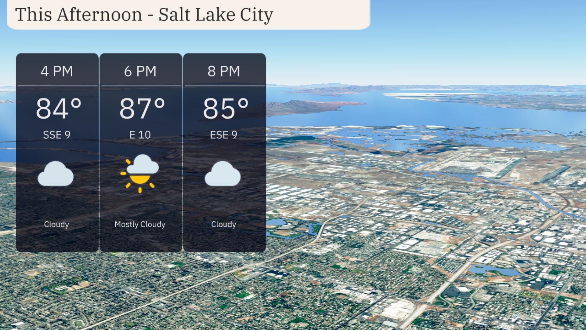 Temperatures in Salt Lake City this afternoon will rise to 87 degrees by 6 PM. Expect mostly cloudy skies during the late afternoon, accompanied by winds shifting from south-southeast at 9 miles per hour to east at 10 miles per hour. By 8 PM, temperatures will slightly drop to 85 degrees as clouds continue to cover the sky.