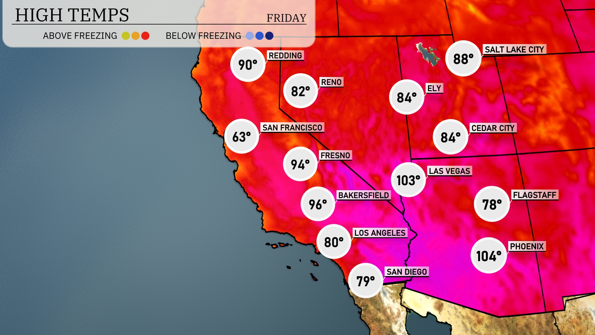 Tomorrow in Phoenix, temperatures are expected to soar to a scorching 104 degrees, significantly above average for this time of year. Las Vegas will also experience a hot day with a high reaching 103 degrees. Over in Bakersfield, California, look for a high of 96 degrees, while Fresno will closely follow at 94 degrees. Los Angeles will remain relatively mild with temperatures hitting 80 degrees. San Diego will see a pleasant day, capped at 79 degrees.