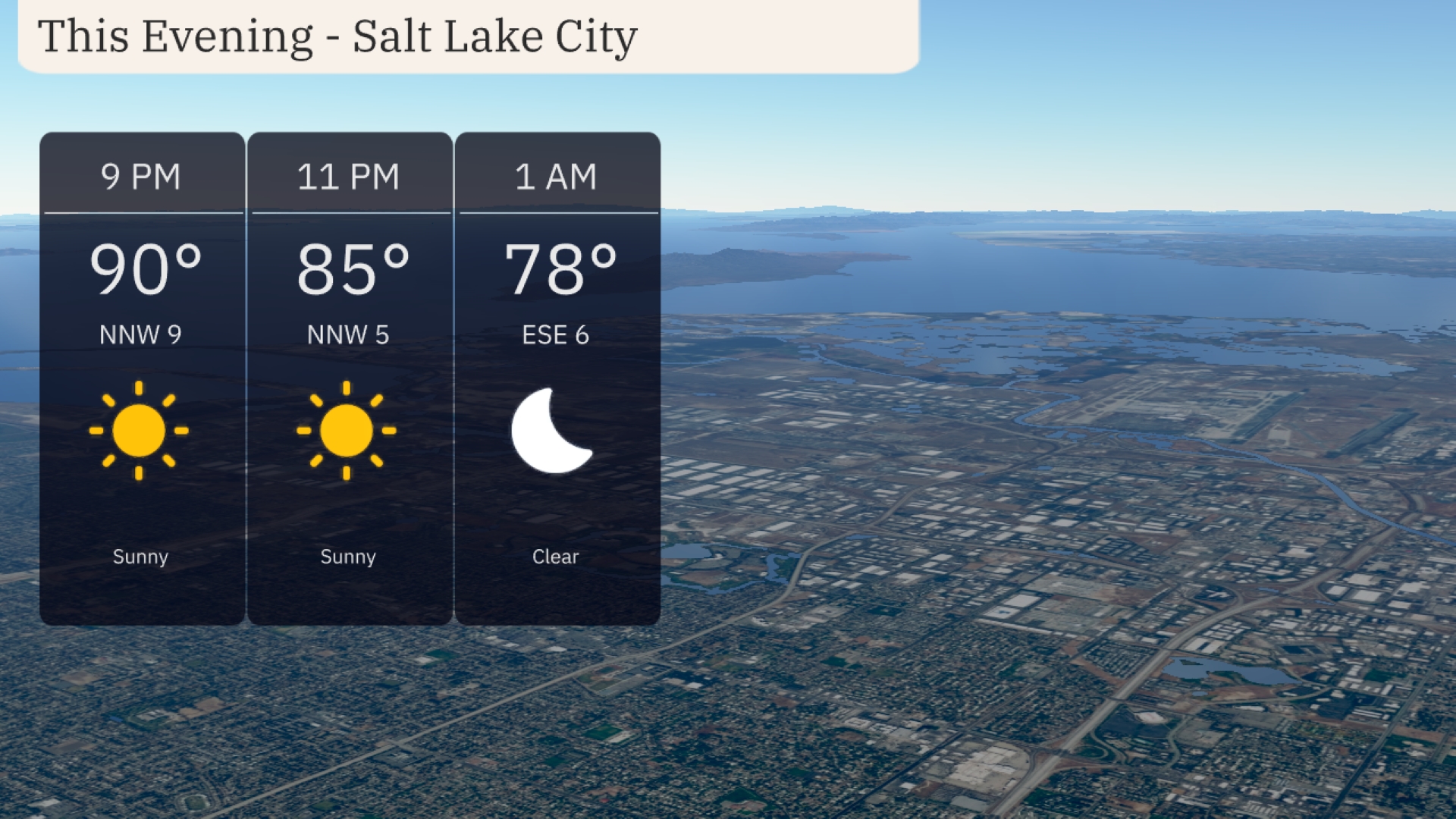 Evening temperatures in Salt Lake City will gradually decrease, starting at 90 degrees at 9 pm, cooling to 78 degrees by 1 am. Winds will shift slightly from north-northwest at 9 mph to east-southeast at 6 mph. Expect clear skies throughout the evening, providing a beautifully calm night.