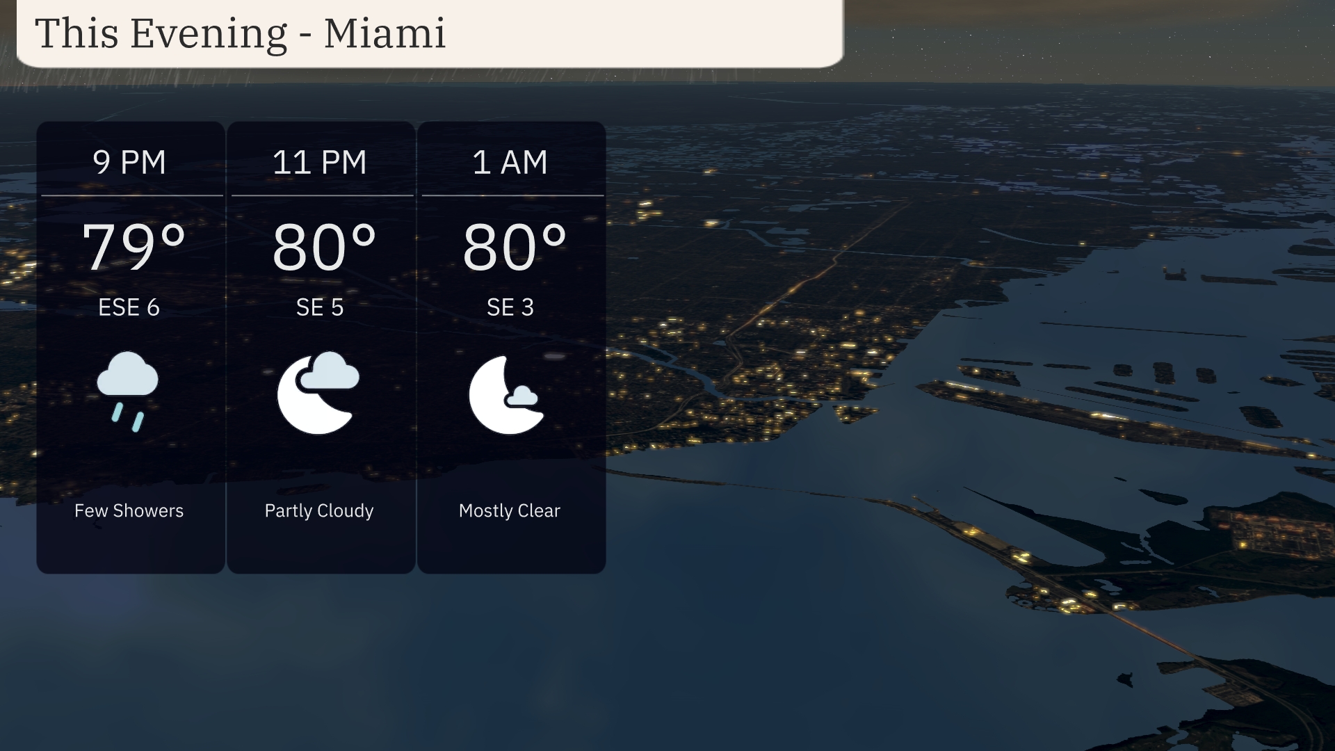 As evening sets in Miami, prepare for a few showers at 9 PM with temperatures around 79 degrees and an east-southeast breeze at 6 miles per hour. By 11 PM, skies turn partly cloudy with temperatures nudging up to 80 degrees, and winds shifting to the southeast at 5 miles per hour. At 1 AM, enjoy a mostly clear sky with temperatures holding steady at 80 degrees, as winds ease to 3 miles per hour.