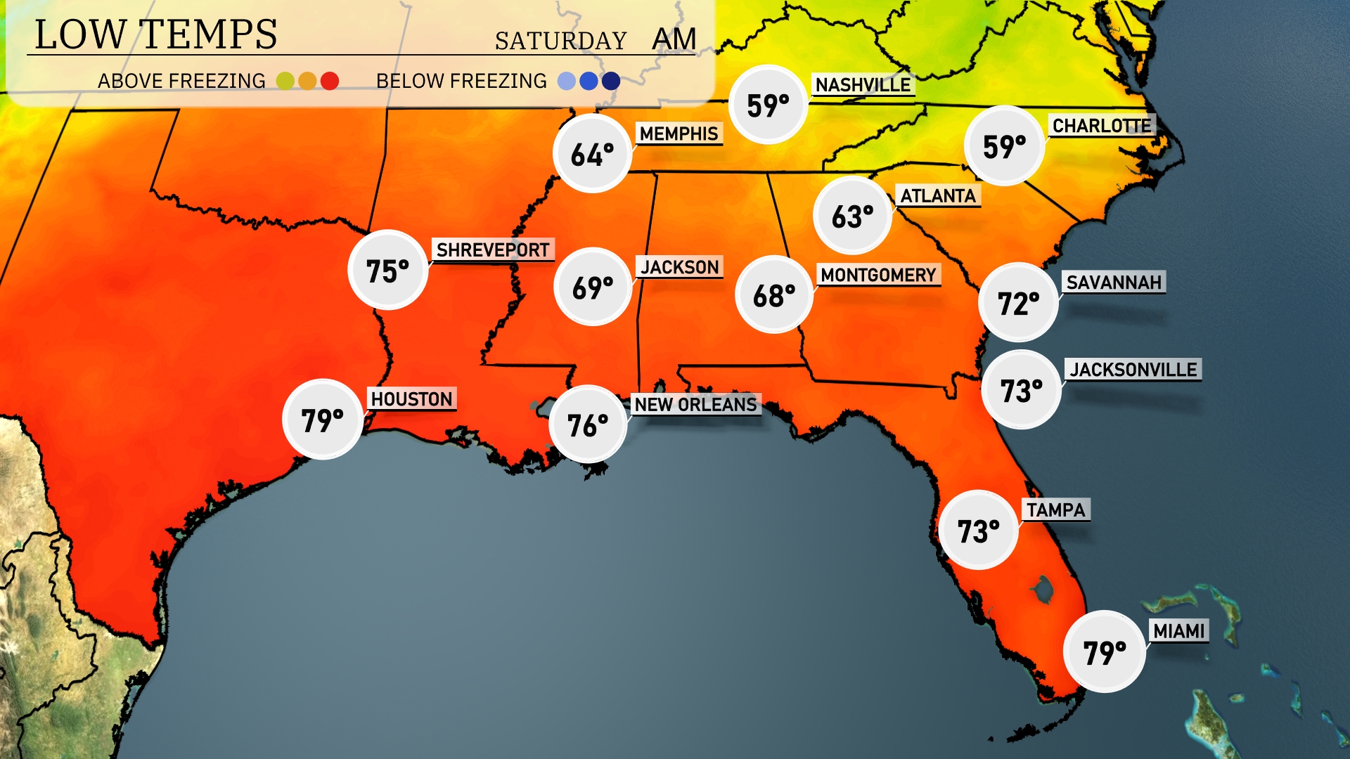 Tonight Nashville will see a low of 59 degrees, while Atlanta will experience slightly warmer temperatures at 63. Montgomery is forecasted for 68 degrees, and Jacksonville will remain mild at 73. Shreveport is expected to drop to 75 degrees, while New Orleans stays warm at 76.
