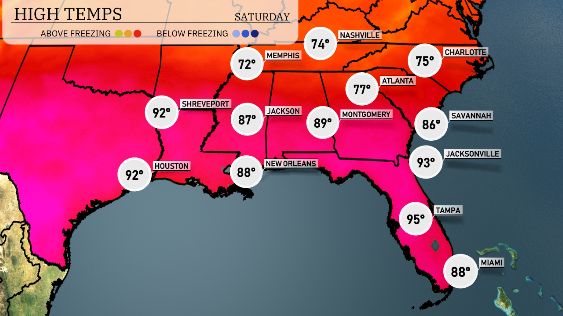 Tomorrow Atlanta can expect a high of 77 degrees, while Charlotte will reach 75. Memphis will warm up to 72 degrees, and further south, Montgomery is set to hit a balmy 89 degrees. New Orleans will see a high of 88, while Tampa hits a sizzling 95 degrees. Over in Jacksonville, temperatures will spike to an impressive 93 degrees, making it one of the hottest spots in the region.