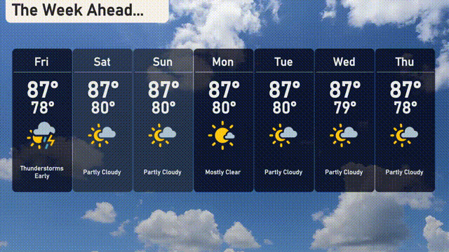 For the 7-day forecast in Miami: Friday: Thunderstorms likely early, with a high reaching 87 degrees and an overnight low of 80 degrees. Saturday: Partly cloudy skies, temperatures steady with a high of 87 degrees and a low of 80. Sunday: The pattern persists with more partly cloudy skies, a high of 87, and a low at 80 degrees. Monday: Mostly clear with sunny intervals, expect a daytime high of 87 degrees and a low near 80. Tuesday: Partly cloudy conditions continue, with temperatures around 87 degrees and dropping to 80 at night. Wednesday: Expect more partly cloudy skies, maintaining a high of 87 degrees and a slightly cooler low of 79. Thursday: Partly cloudy once more, with the temperature topping at 87 degrees and a low at 78 degrees.