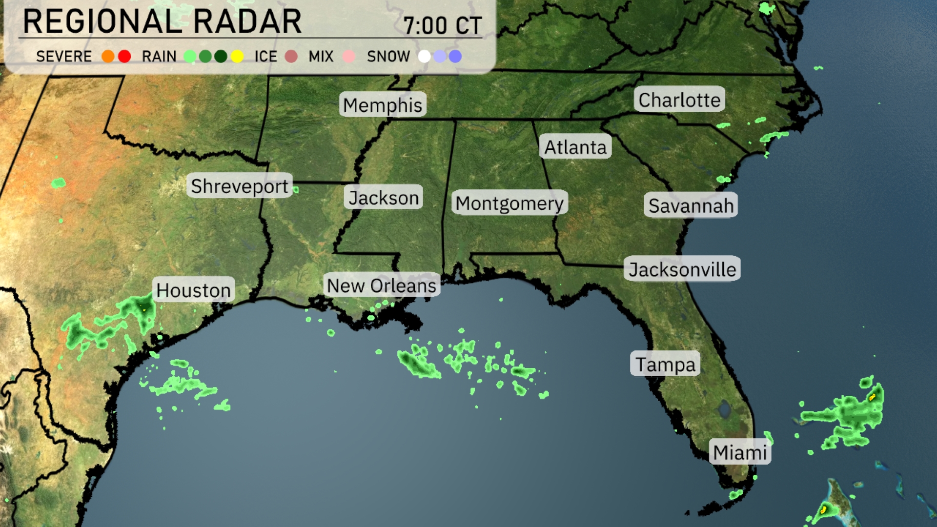 The Southeast region is experiencing a range of weather conditions. In southeastern Texas, near Houston, rain showers are progressing northeastward, potentially spreading into Louisiana. Light rain is scattered across the Gulf Coast, particularly affecting areas like New Orleans. Moving eastward, the skies remain mostly clear across Atlanta and Montgomery, providing a dry morning. Mild cloud cover is seen off the coast of Florida, with areas like Miami enjoying clear skies at the moment.