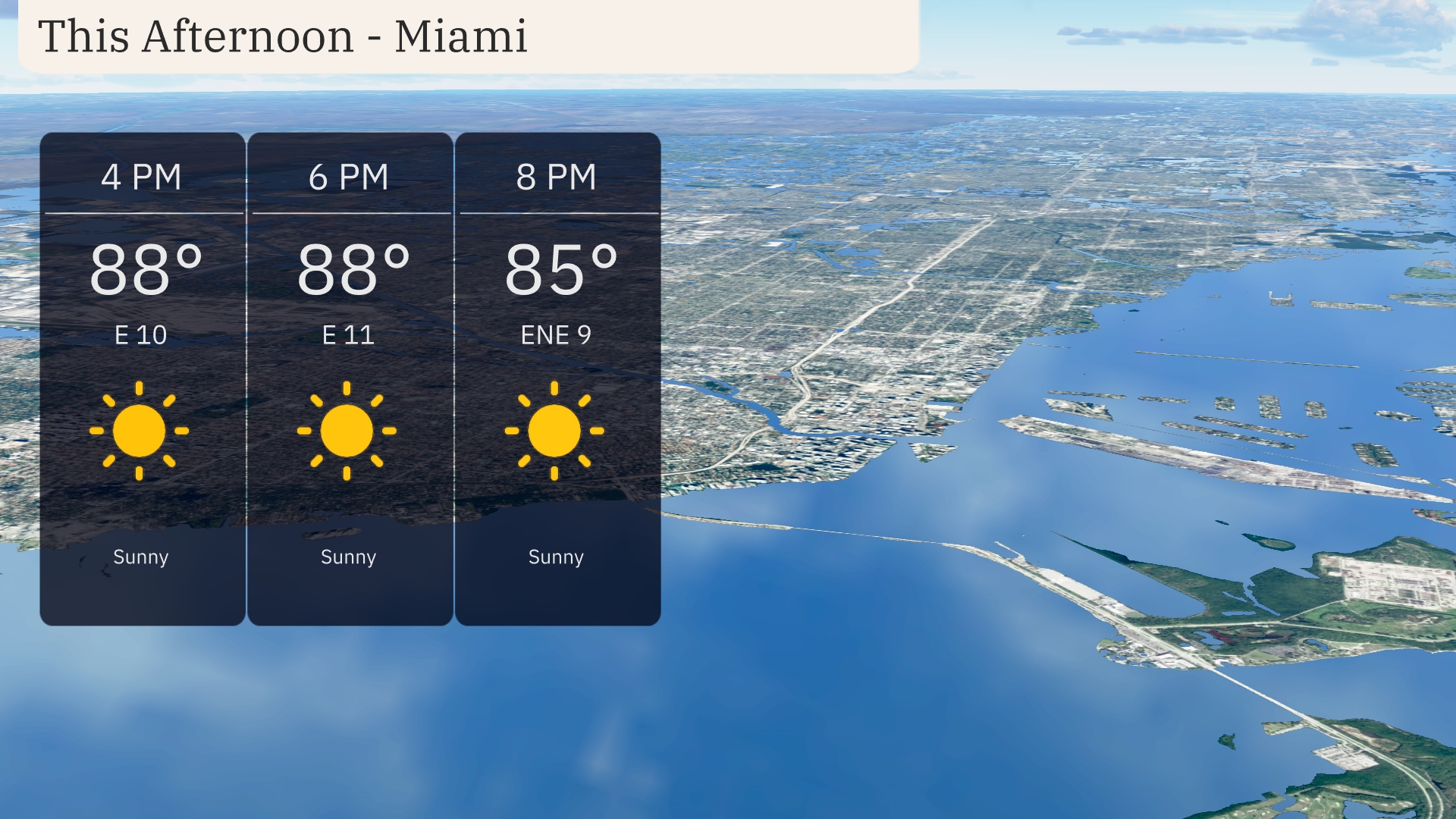 Sunny skies will dominate the Miami afternoon with temperatures holding steady at 88 degrees. An easterly breeze at 10 miles per hour adds a refreshing touch to the warm weather. By evening, temperatures will dip slightly to 85 degrees with winds coming from the east-northeast at 9 miles per hour.
