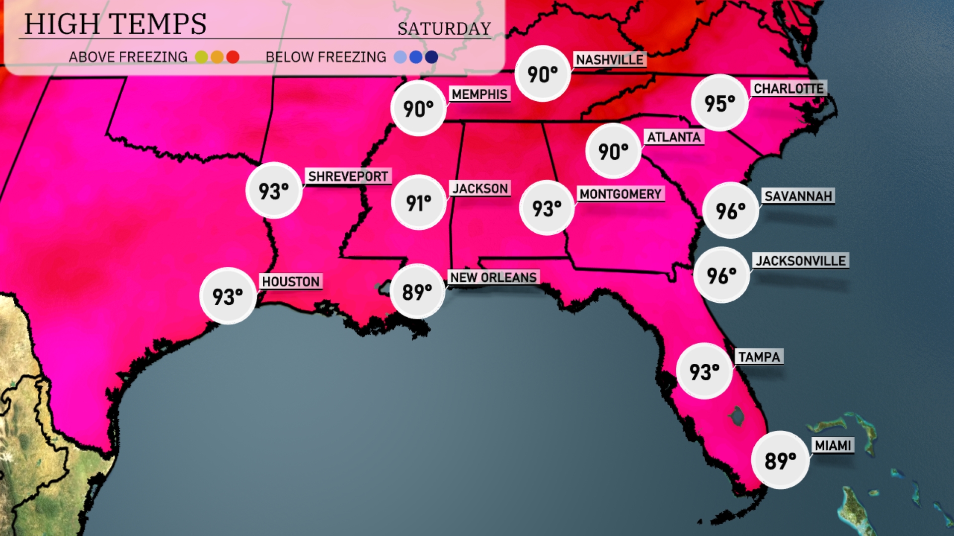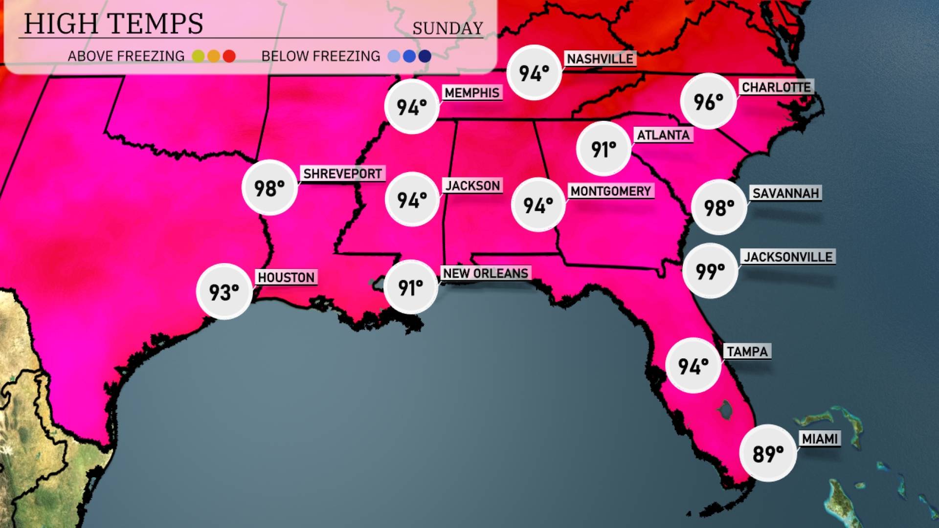 Tomorrow in Nashville, expect a high of 94 degrees, while Memphis also reaches 94. Atlanta will be slightly cooler at 91 degrees. Over in Florida, Jacksonville is poised for a sizzling 99 degrees, and Savannah isn’t far behind at 98. New Orleans will see highs around 91 degrees, reflecting above-average temperatures across the region due to high pressure dominating the Southeast.