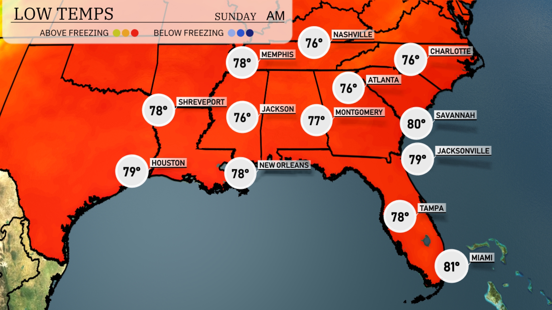 Tonight in the Southeast, temperatures will remain warm, with Memphis experiencing a low of 76 degrees. Jackson will settle at 76, while Montgomery is expected to drop slightly to 77. Atlanta will see a similar low at 76 degrees, and Savannah is looking at a balmy 80 degrees. Jacksonville will cool down to 79 degrees, making for a milder night across the region.