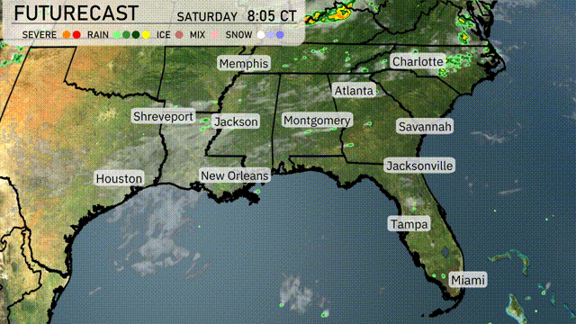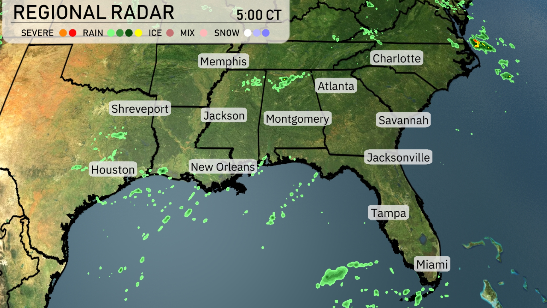 On the Regional Radar, we’re seeing scattered showers across eastern Louisiana and parts of Mississippi, particularly near Jackson. These showers are gradually moving northeast, poised to impact areas like Montgomery and Atlanta later in the day. A cluster of rain showers off the western coast of Florida is making its way toward Tampa. The rest of the Southeast, including areas like Shreveport and Jacksonville, remains relatively clear for now but with increasing cloud cover.