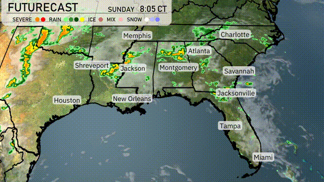 A cluster of strong storms is currently over Charlotte and moving northeastward, bringing rain and possible severe weather. Atlanta is experiencing moderate rain showers, while Savannah is also seeing a band of thunderstorms. Rain extends further into the Carolinas, with rain clouds spreading towards the coastline. Meanwhile, New Orleans and Houston enjoy clearer conditions, with some patchy clouds. Miami and Tampa are relatively dry, but some scattered light showers are drifting over northern Florida.