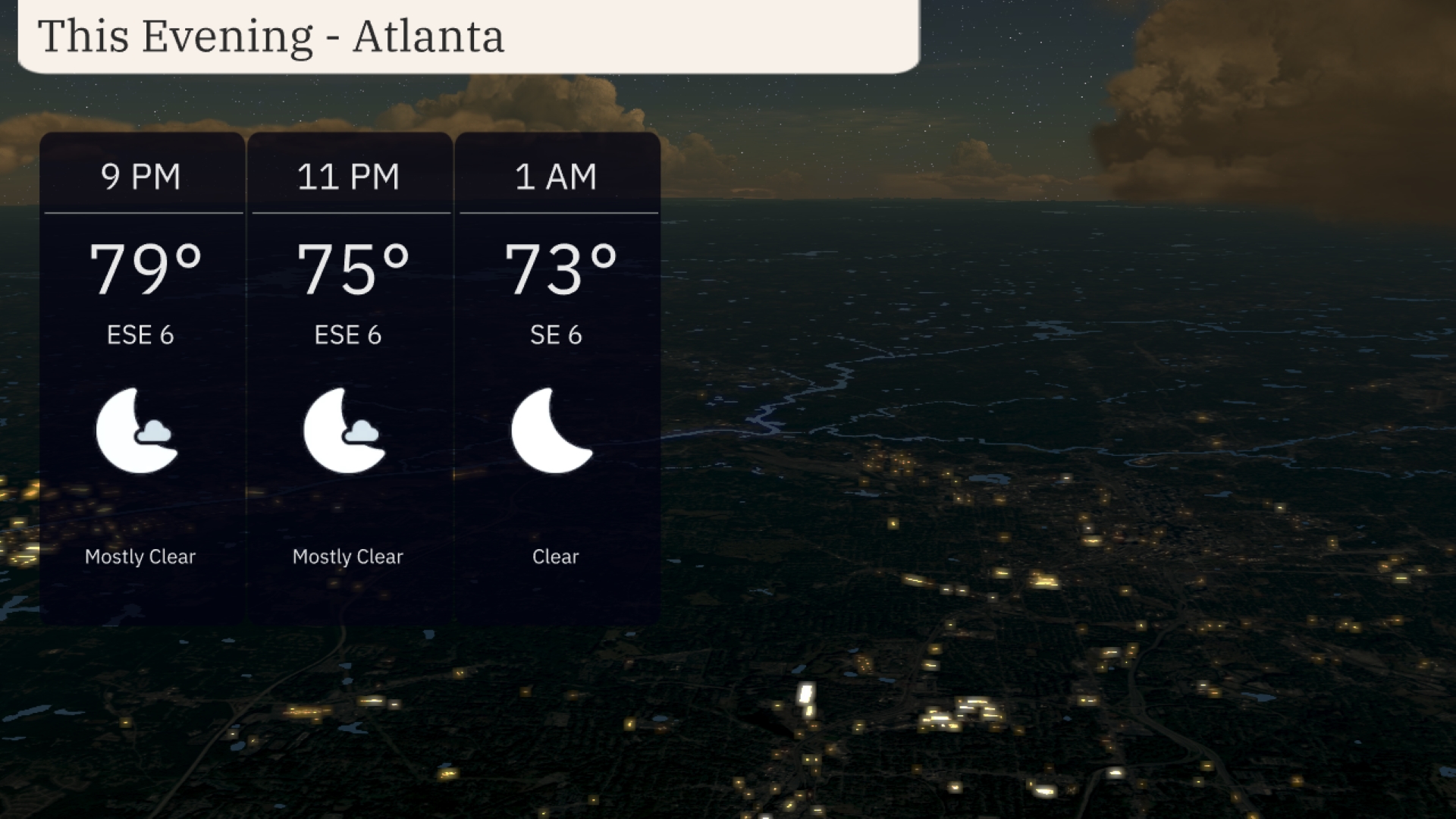This evening in Atlanta, enjoy mostly clear skies with temperatures starting at 79 degrees at 9 PM and gradually cooling to 73 degrees by 1 AM. Winds will be gentle from the east-southeast at 6 miles per hour, making outdoor activities quite pleasant.