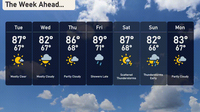 Tuesday: Mostly clear with a high of 87 degrees and a low of 67.