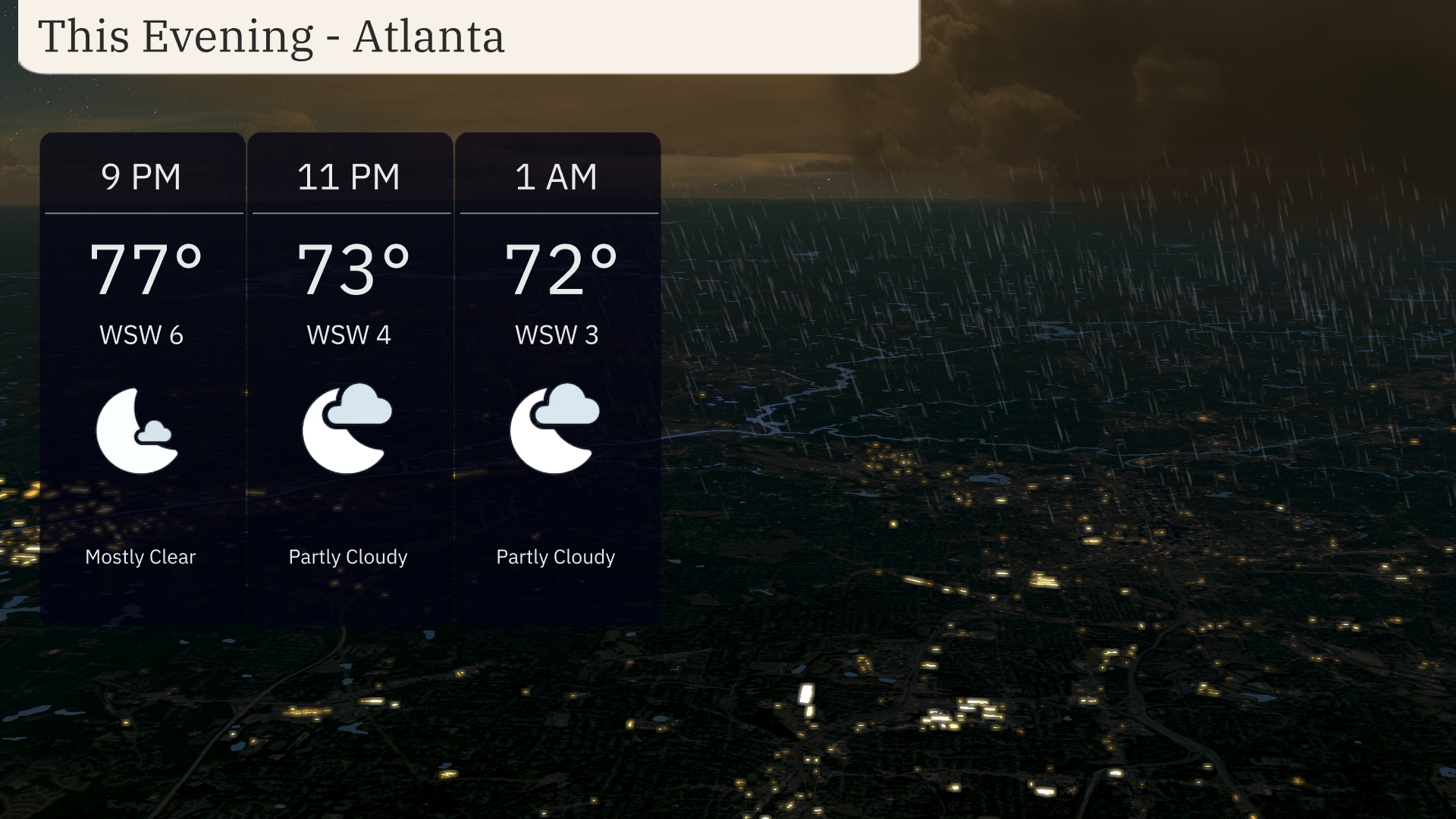 This evening in Atlanta, temperatures will gradually decrease from 77 degrees at 9 PM to 72 degrees by 1 AM. Winds will be light, coming from the west-southwest at 6 to 3 miles per hour. Expect mostly clear skies initially, transitioning to partly cloudy by late evening.