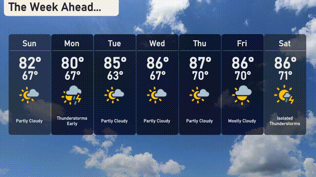 For the 7 Day Outlook in Atlanta: Sunday: Partly cloudy with a pleasant high of 82 degrees and a low of 67 degrees. Monday: Thunderstorms early with temperatures reaching a high of 80 degrees and a low of 67 degrees. Tuesday: Look for partly cloudy skies with a warm high of 85 degrees and a low staying at 63 degrees. Wednesday: More partly cloudy conditions with highs around 86 degrees and lows near 67 degrees. Thursday: Enjoy the sunshine with a high of 87 degrees and a nighttime low of 70 degrees. Friday: Mostly cloudy skies, reaching a high of 86 degrees and a low of 70 degrees. Saturday: Isolated thunderstorms are possible with temperatures peaking at 86 degrees and a low of 71 degrees.