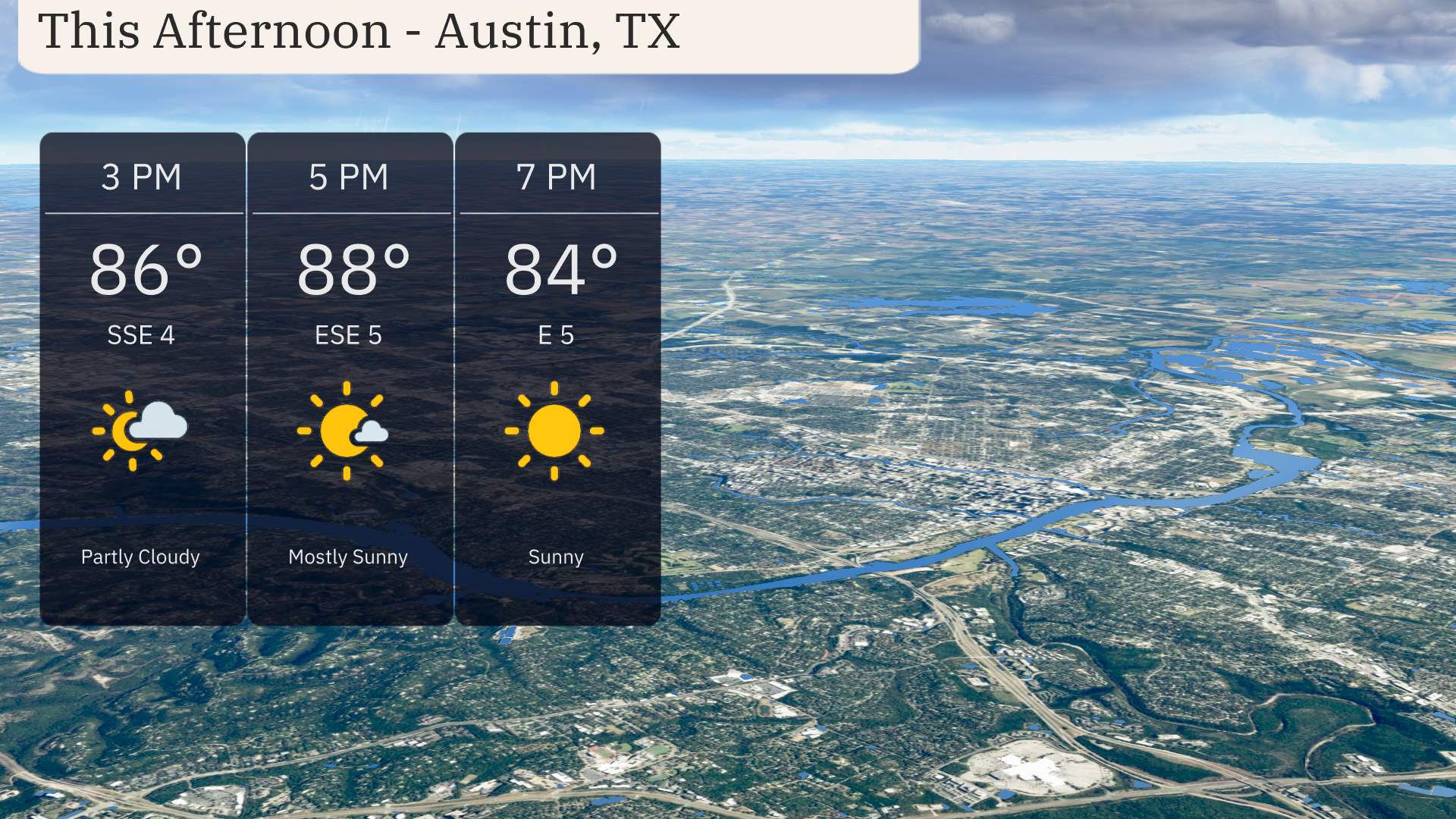 This afternoon in Austin, expect warm temperatures reaching 86 degrees by 3 PM, rising to 88 degrees by 5 PM, before cooling slightly to 84 degrees at 7 PM. Skies will shift from partly cloudy to mostly sunny as the afternoon progresses, accompanied by gentle southeast to east-southeast winds at 4 to 5 miles per hour. Perfect conditions for outdoor activities as the day brightens up!