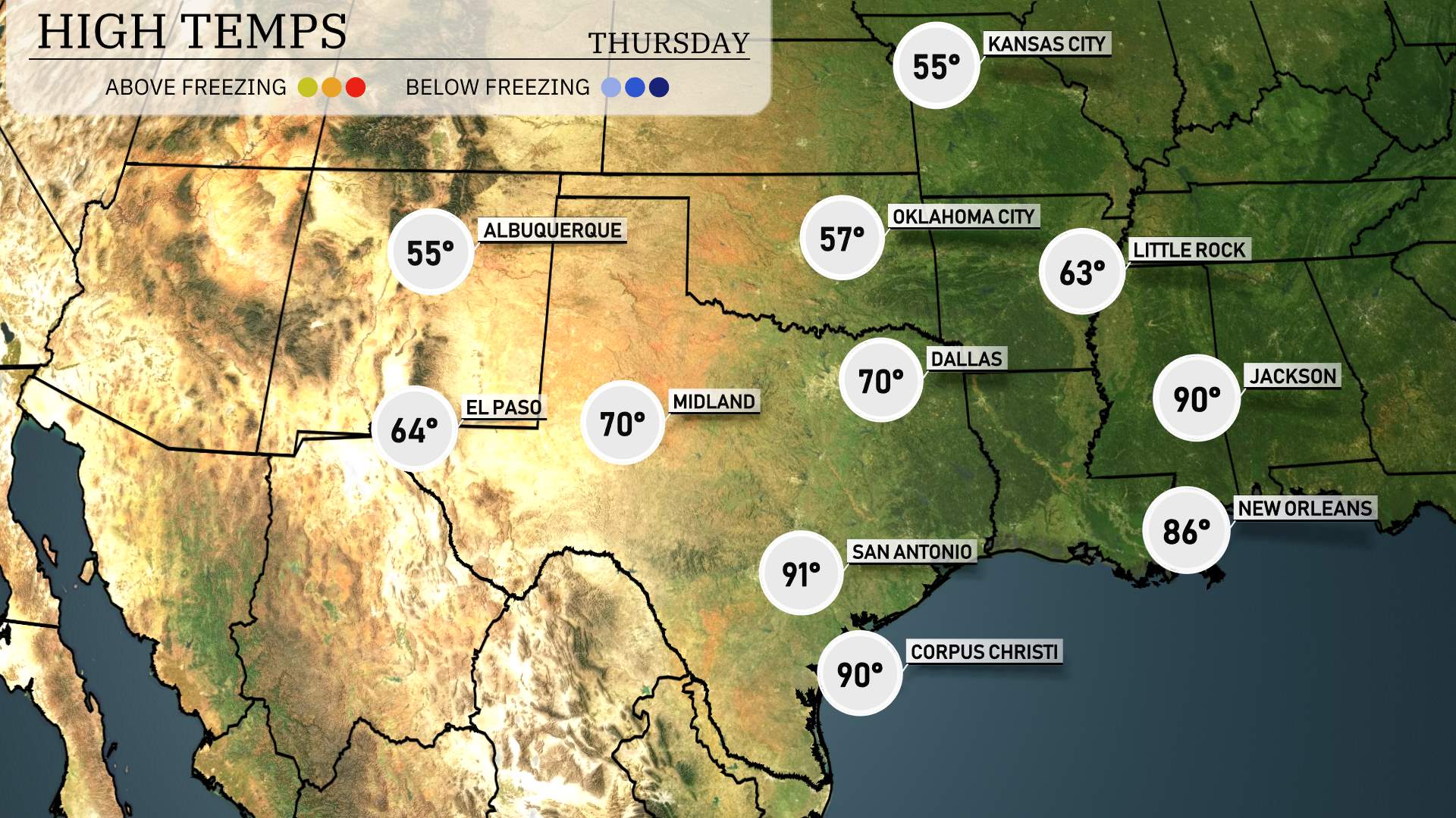In El Paso, the high is expected to be a comfortable 74 degrees. Midland will experience warmer temperatures, reaching up to 85 degrees, which is slightly above average for this time of year. San Antonio is looking at a warm 81 degrees under mostly sunny skies. Meanwhile, Corpus Christi will enjoy a balmy 79 degrees as coastal conditions keep temperatures mild.