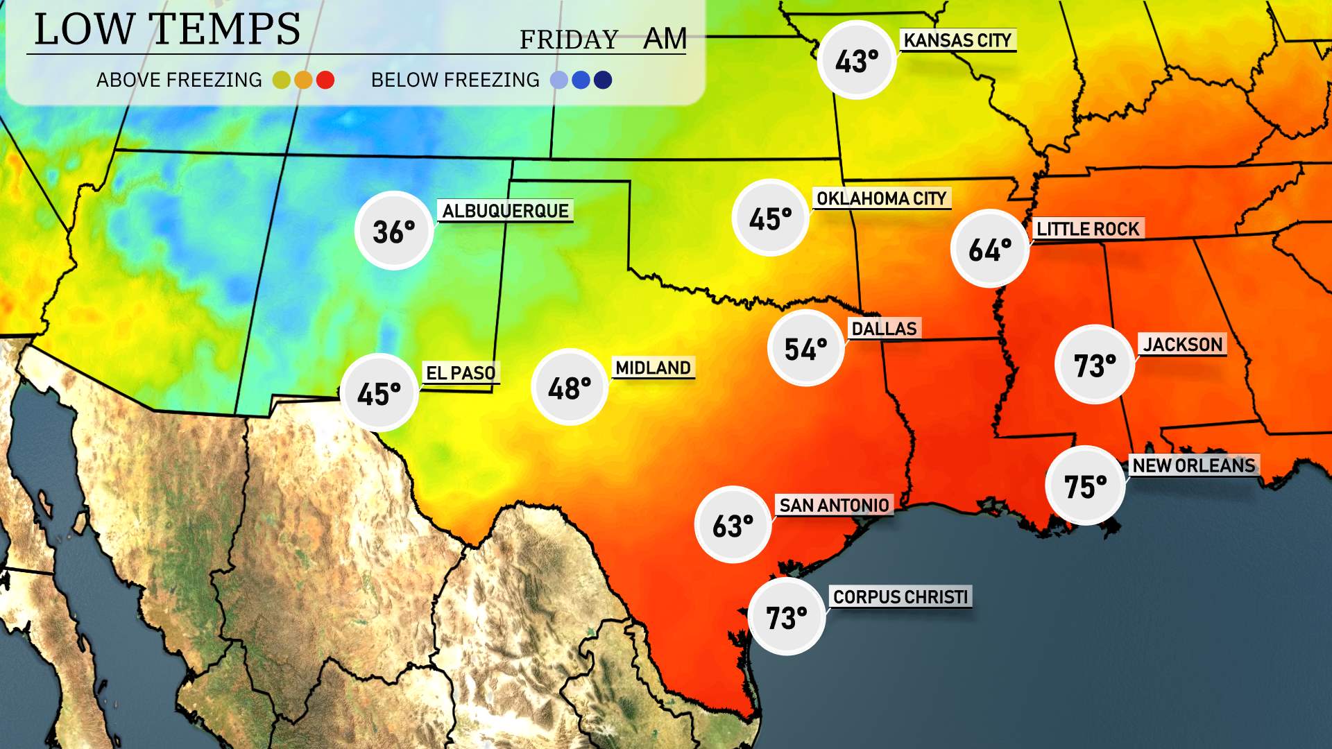 Down south, in New Mexico, El Paso is maintaining a comfortable high of 64 degrees. Overall, we have a noticeable contrast across the region, with those warmer spots in Texas compared to the cooler air in Oklahoma and Arkansas. Stay tuned for updates!