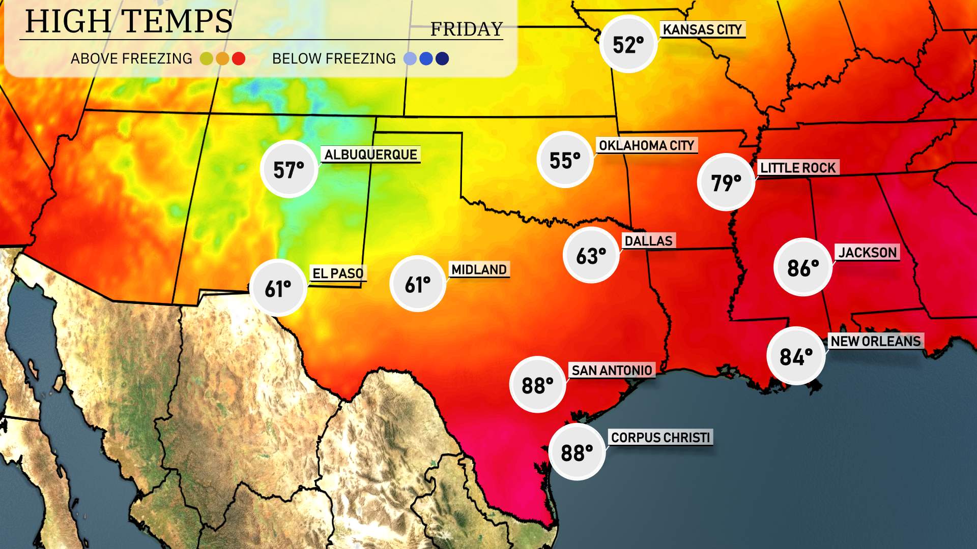 Good afternoon! Let’s take a look at today’s high temperatures in the Southern Plains.