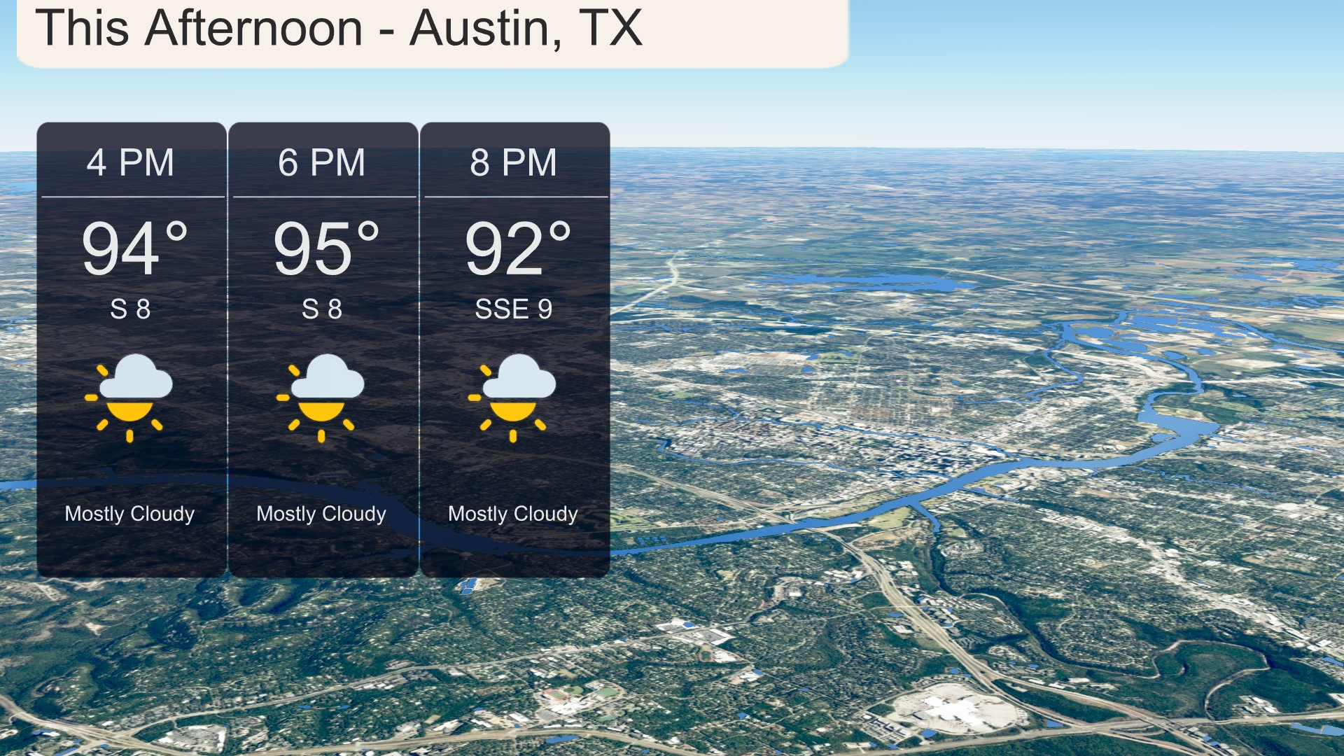 For this afternoon in Austin, expect temperatures climbing to 94 degrees by 4 PM, rising slightly to 95 degrees by 6 PM. Winds will be gentle at around 8 mph from the south. The predominant condition is mostly cloudy, which will persist into the evening as temperatures slightly dip to 92 degrees by 8 PM with winds shifting to SSE at 9 mph.