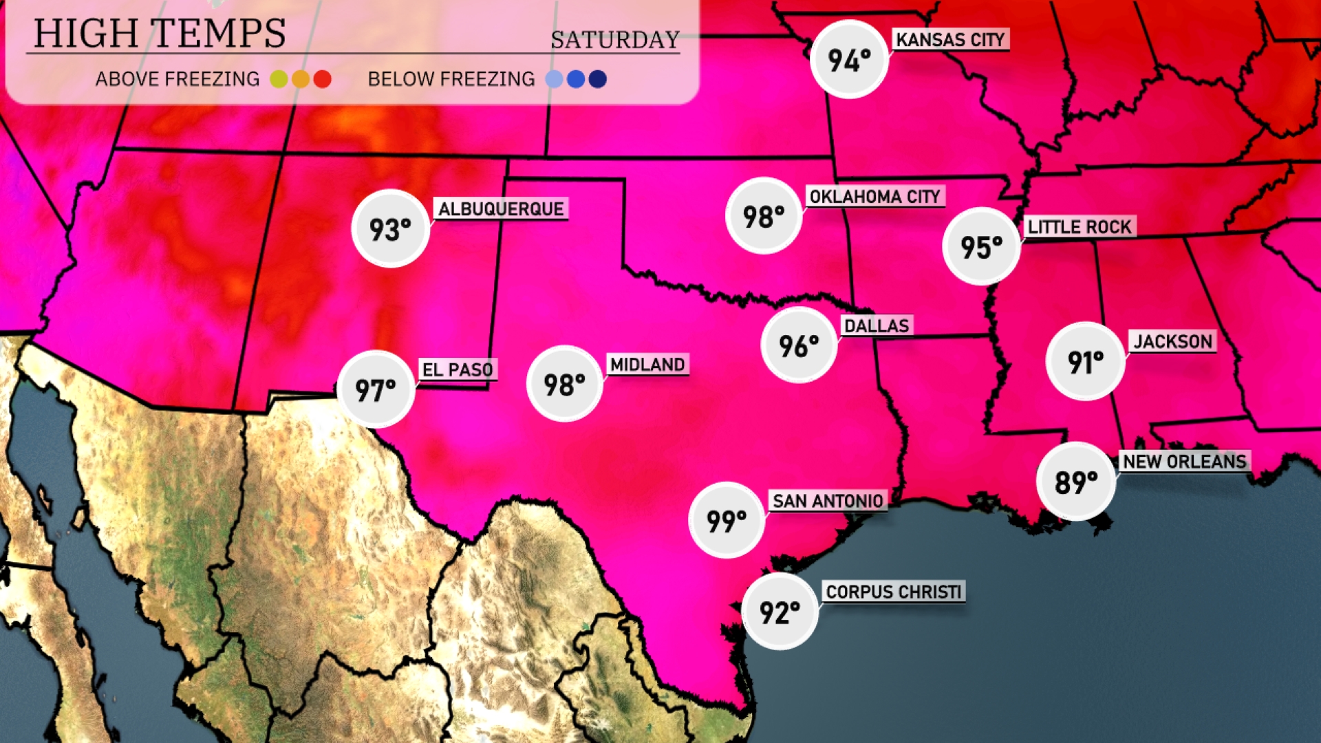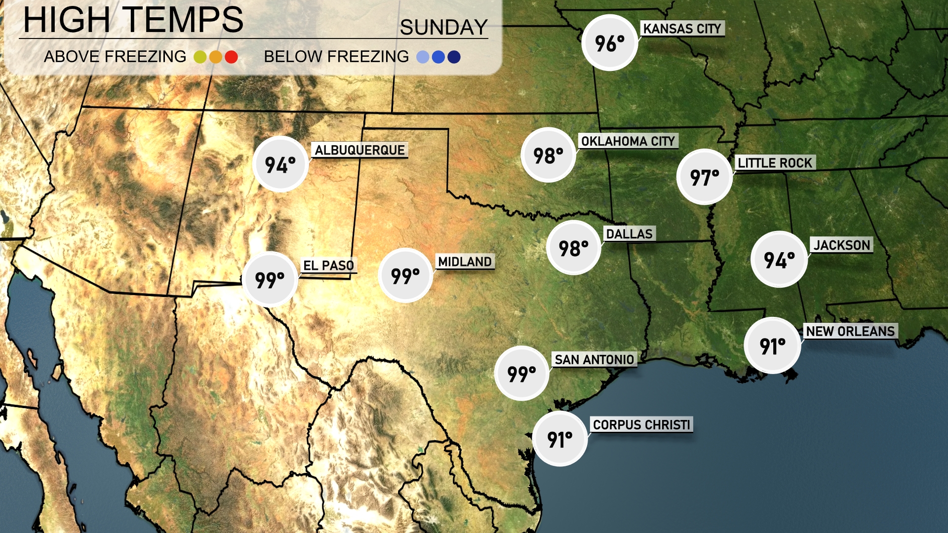 Tomorrow in the Southern Plains, El Paso will see a sizzling high of 99 degrees. Midland matches that with another 99-degree afternoon, while San Antonio also reaches 99 degrees. Dallas is slightly cooler at 98 degrees, and Oklahoma City will experience a high of 98 as well. New Orleans and Corpus Christi will be milder, with highs of 91 and 91 degrees respectively, indicating a warmer trend across the region.