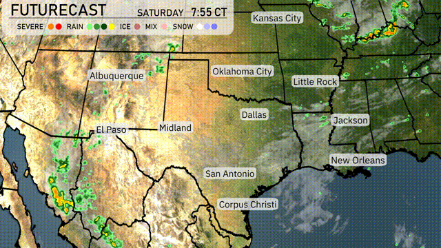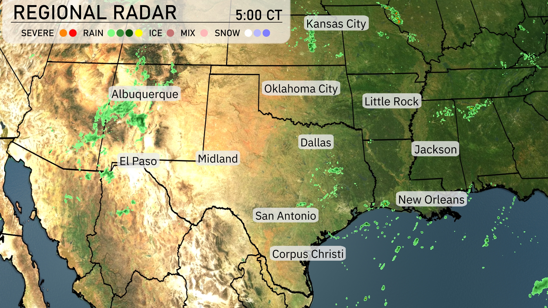 A band of rain is sweeping through western Texas, stretching from El Paso to Midland, showing scattered showers. Oklahoma City and Dallas are experiencing mostly clear conditions, while clouds are increasing around Little Rock and Jackson. Towards Albuquerque, there are some light rain showers developing, bringing a slight chance of wet weather. Clear skies dominate over areas like San Antonio and Corpus Christi, offering a pleasant break from stormy weather.