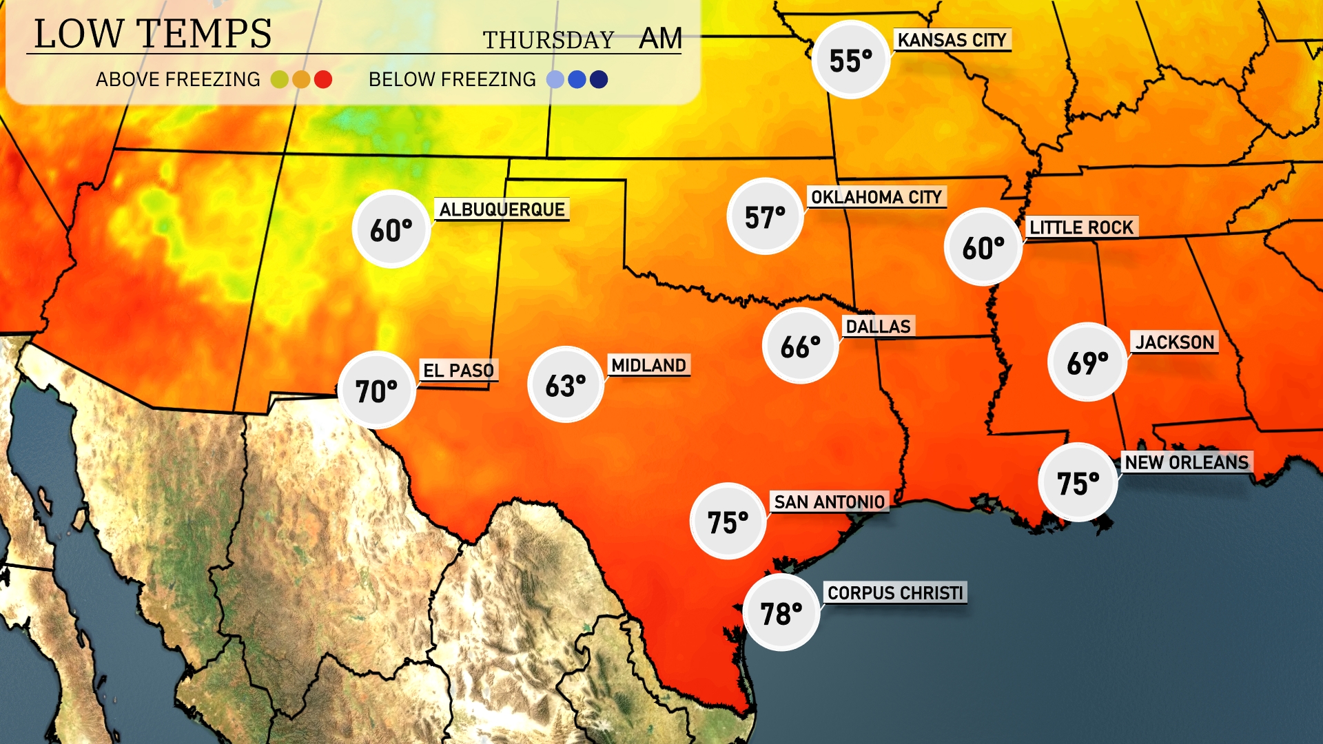 Tonight in Oklahoma City will see a low of 55 degrees, while Dallas checks in at 66. Up north, Little Rock will experience a chilly 60 degrees. Farther west, Midland is predicted to cool down to 63 degrees. Expect warmer temperatures along the coast, with San Antonio at 75 and Corpus Christi at 78.