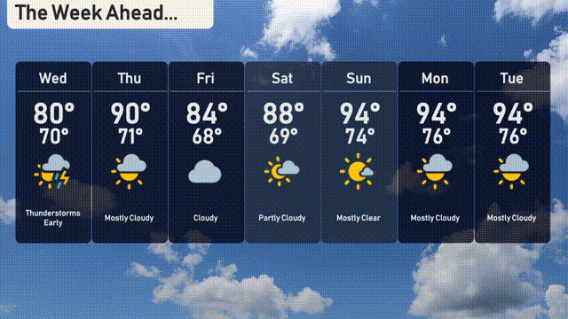 Tuesday: Mostly cloudy conditions persist with a high of 94 degrees and a low of 76.