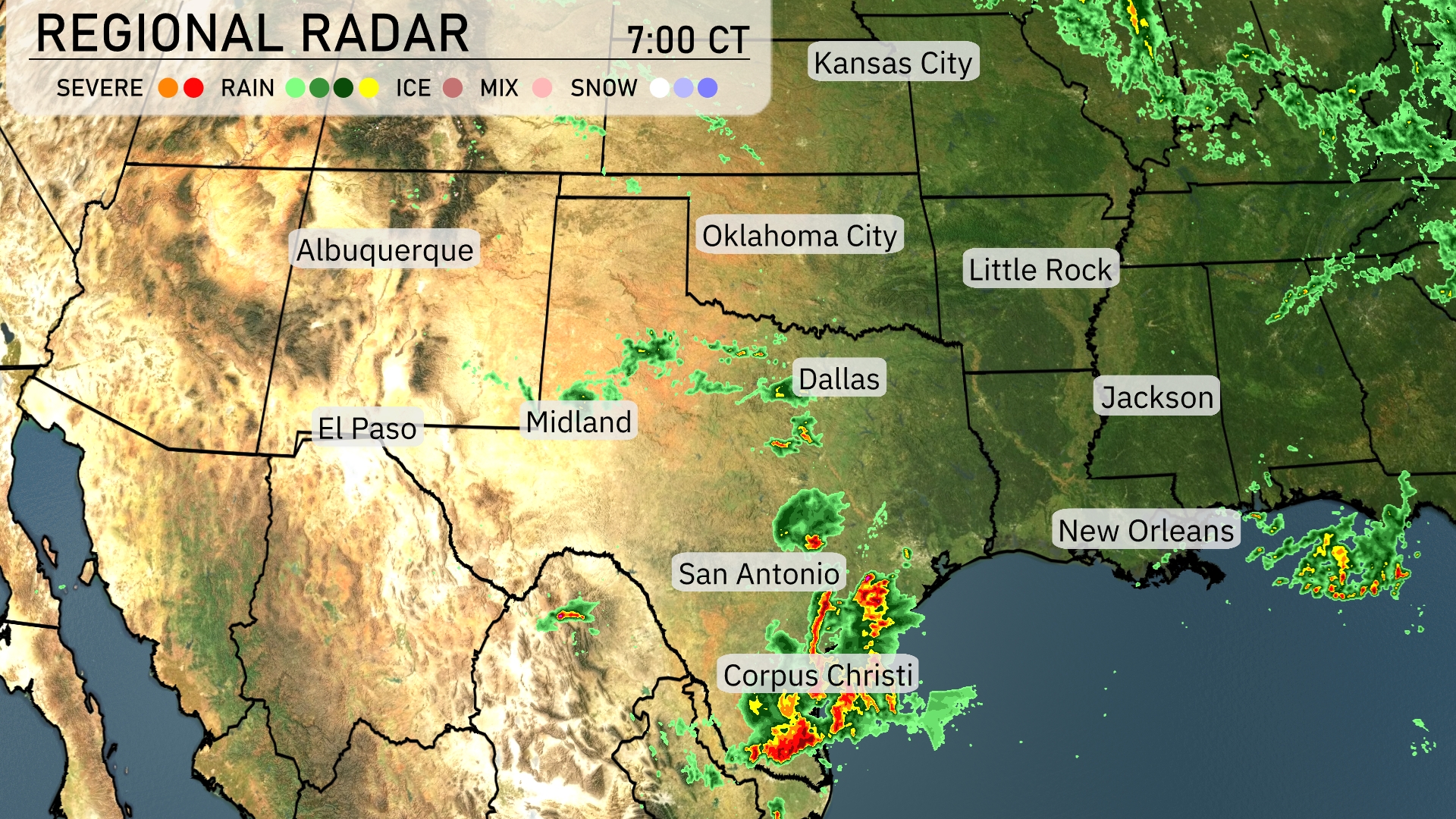 On the Regional Radar, severe thunderstorms are currently impacting Corpus Christi, pushing towards the northeast into the coastal areas of Texas. San Antonio may soon see some rain as the storm system progresses. Dallas is experiencing scattered showers though nothing severe at the moment. Meanwhile, cloud cover extends into the Oklahoma City region with potential rain development. Near El Paso, the weather remains clear, offering a reprieve from the stormy conditions elsewhere.