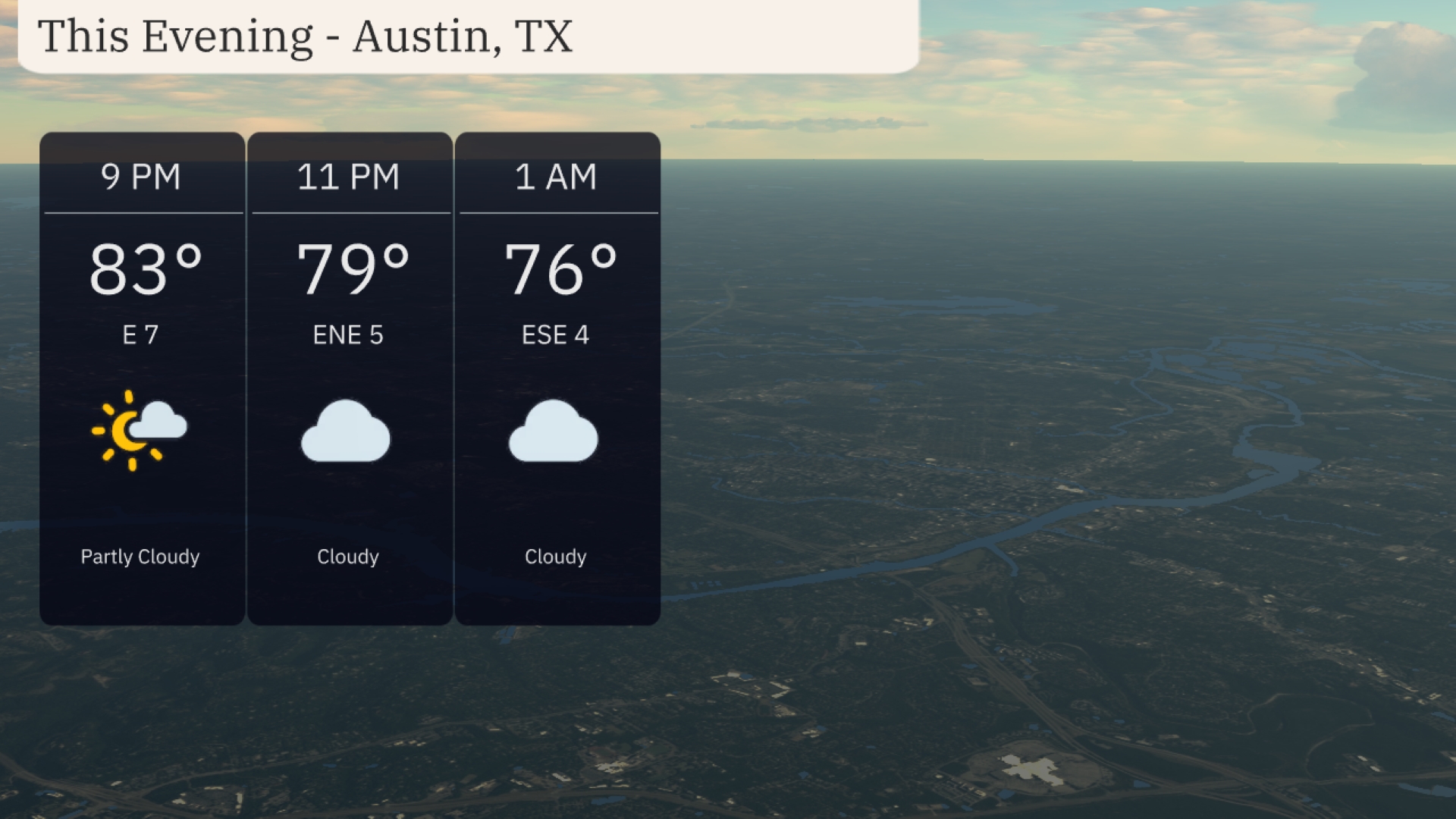For this evening in Austin, anticipate partly cloudy skies transitioning to cloudy by 11 PM. Temperatures will start at 83 degrees at 9 PM and gradually decrease to 76 degrees by 1 AM. Winds will be gentle, shifting from east at 7 mph to east-southeast at 4 mph overnight.