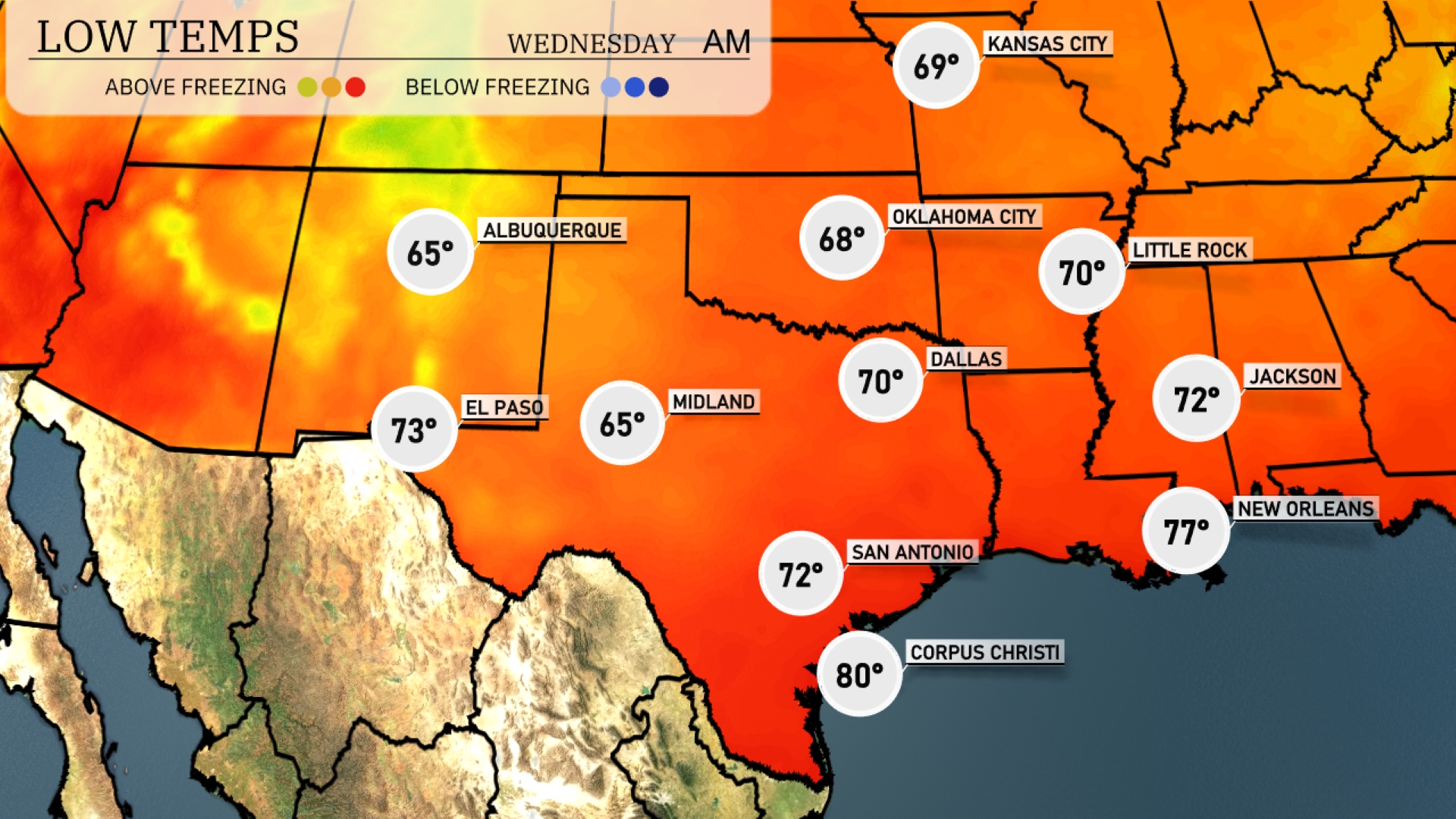Tonight in the Southern Plains, temperatures are set to drop significantly. Dallas will see a low of 70 degrees, while Little Rock is forecasted to dip to 70 as well. Expect Midland to cool down to 65 degrees, a noticeable drop compared to earlier in the week. San Antonio will rest at 72 degrees, with New Orleans staying warmer at 77.