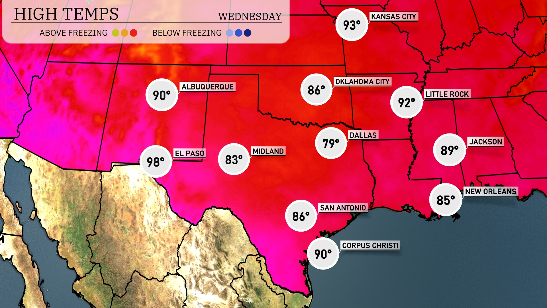 Tomorrow, El Paso is set to reach a scorching high of 98 degrees. Midland will see slightly cooler temperatures at 83 degrees. San Antonio is in for a warm day, with a high of 86 degrees. Dallas has a milder forecast, peaking at 79 degrees. Corpus Christi is expected to hit 90 degrees, reflecting above-average temperatures across the Southern Plains.