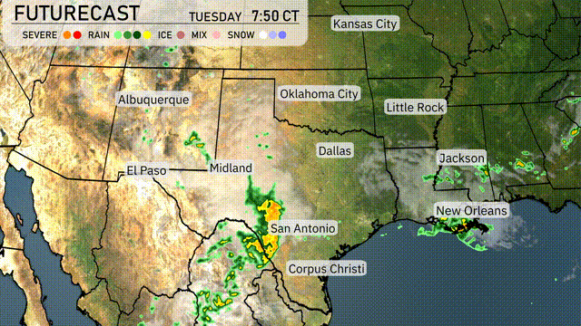 A cold front is set to move through the Southern Plains, from San Antonio to Oklahoma City, stirring up showers and thunderstorms. Expect strong storms especially near Midland and Dallas with potential for localized flooding through Tuesday night. By early Wednesday, rain spreads from Jackson to Little Rock, with gusty conditions likely. Temperatures will remain warm ahead of the front but will slightly dip once it passes.