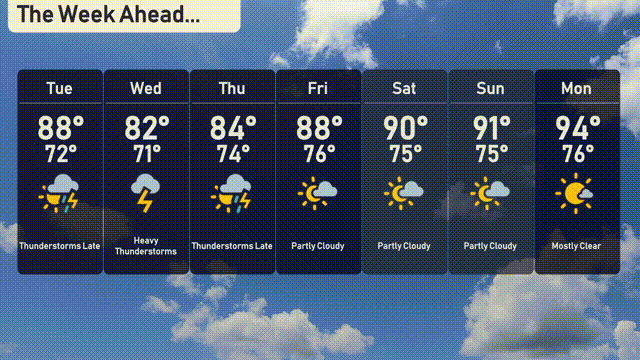 Friday: Partial clearing brings a mix of clouds and sun, with a high of 88 degrees and a low of 76 degrees.