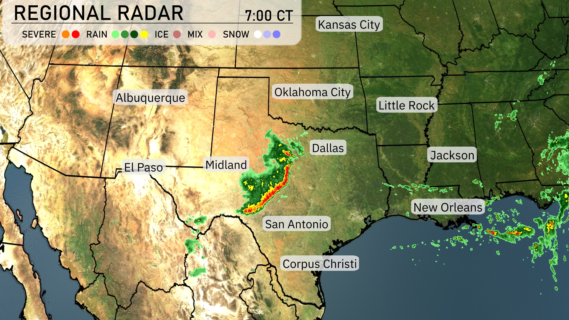 A vibrant line of storms is stretching from west to east across the Southern Plains, primarily affecting areas from Midland to San Antonio, Texas. This storm line is edging toward Dallas with increased intensity, marked by heavy rain and possibly severe weather. In the eastern sector, New Orleans is seeing consistent rainfall as the line continues to drift eastward. A steady patch of showers is present northeast of Jackson, heading toward the Alabama state line.