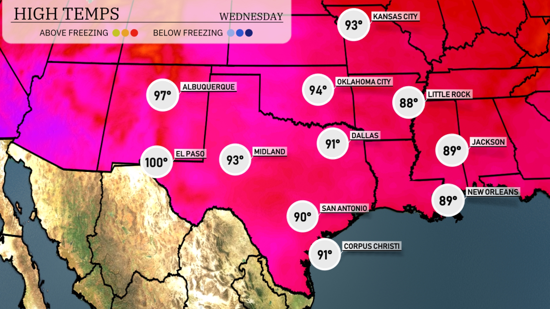 In the Southern Plains today, we’re seeing some impressive highs across the region. El Paso is sizzling at 100 degrees, while Midland is hot at 93. In Dallas, temperatures reach 91 degrees, and San Antonio isn’t far behind with a high of 90. Little Rock experiences a cooler afternoon at 88 degrees, contrasting sharply with the Texas warmth. In New Orleans and Jackson, both cities hit 89, offering a muggy and warm day.
