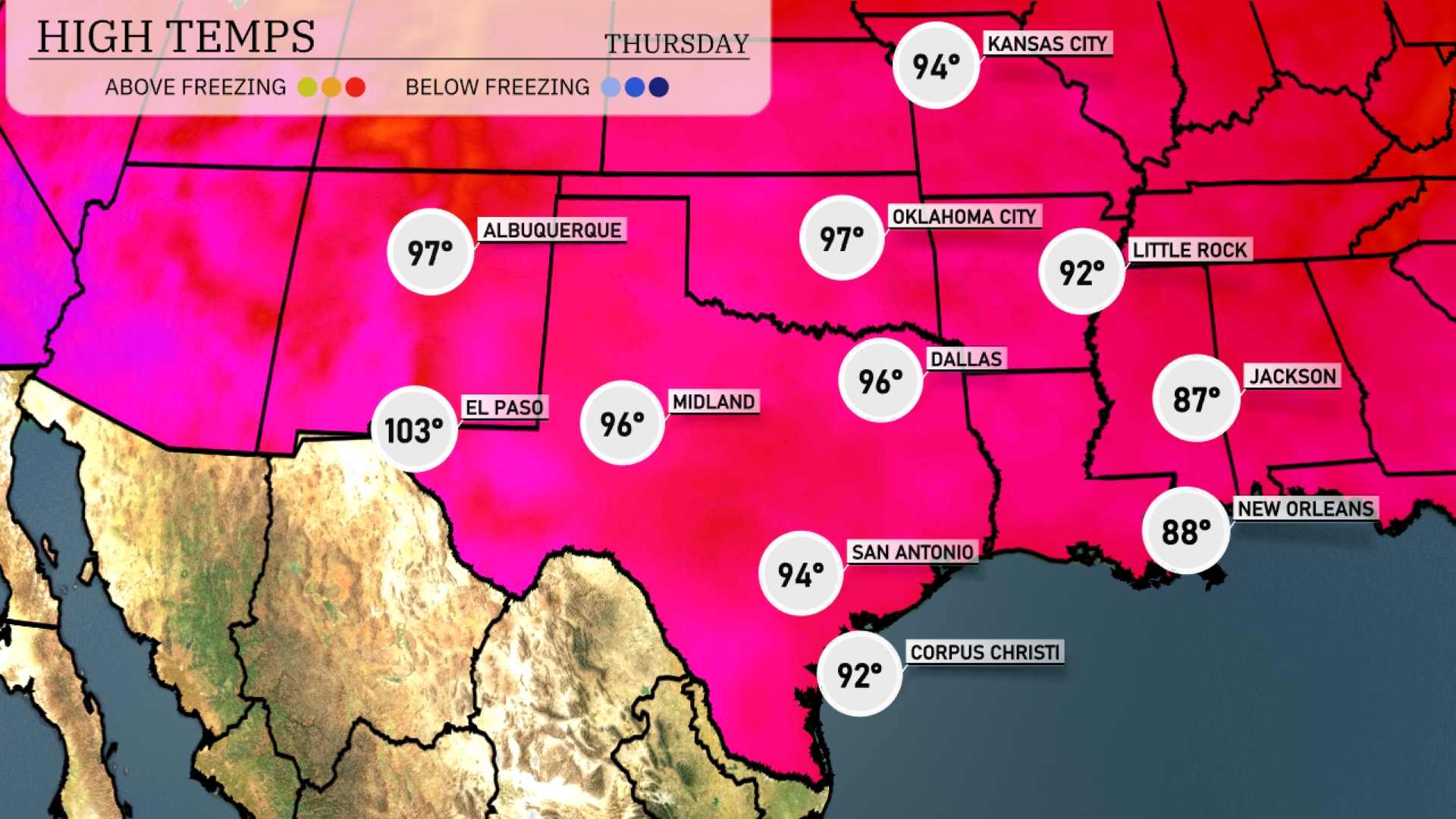 Tonight, Dallas is expected to dip to 75 degrees, while Oklahoma City will be just slightly cooler at 74. Further south, San Antonio will see a low of 75 degrees, with Midland close behind at 72. In the eastern parts, Jackson will cool off to 71 degrees, and New Orleans will rest at a mild 77 for the night.