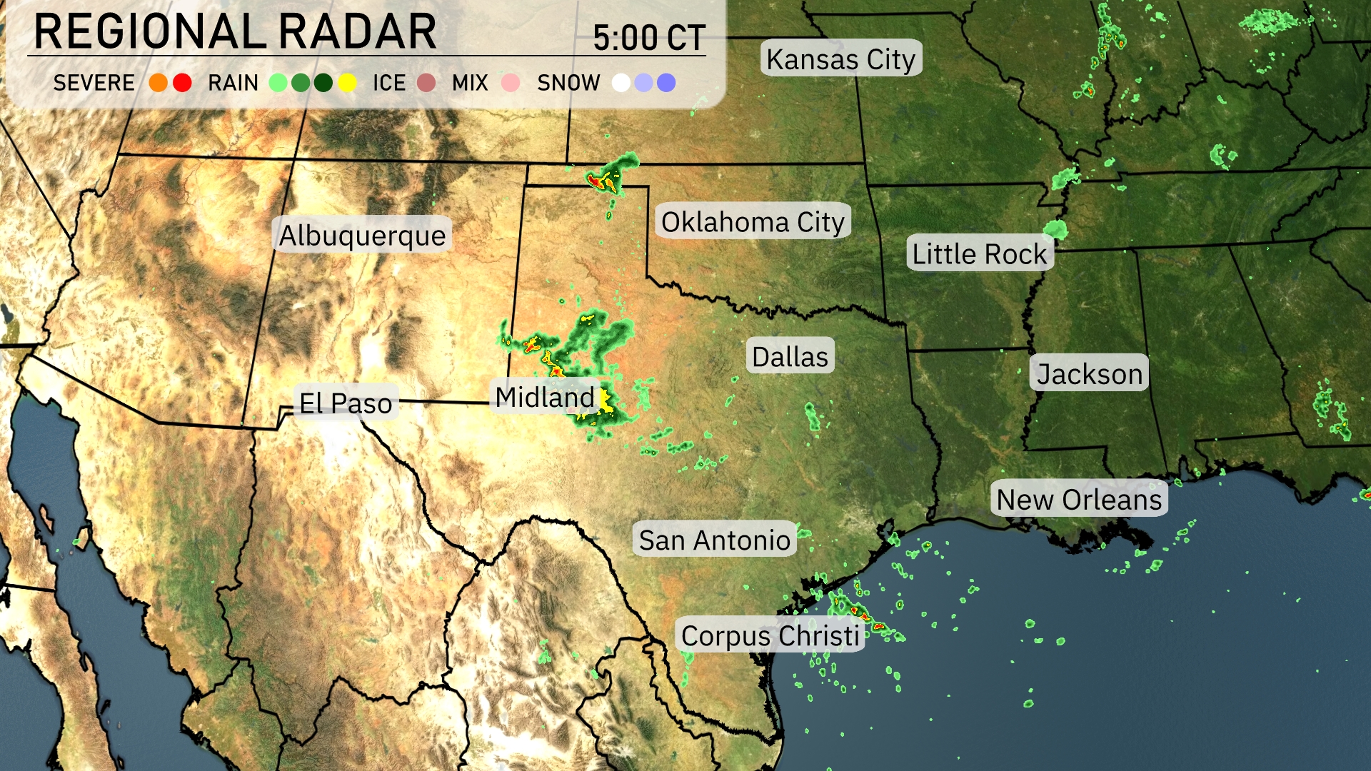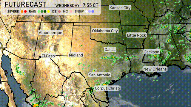 A line of showers is progressing through central Texas, notably impacting Midland with moderate rain. Scattered precipitation patches are also visible around San Antonio, moving southeast towards Corpus Christi. El Paso remains dry, while isolated showers maneuver across Oklahoma, particularly north of Oklahoma City.
