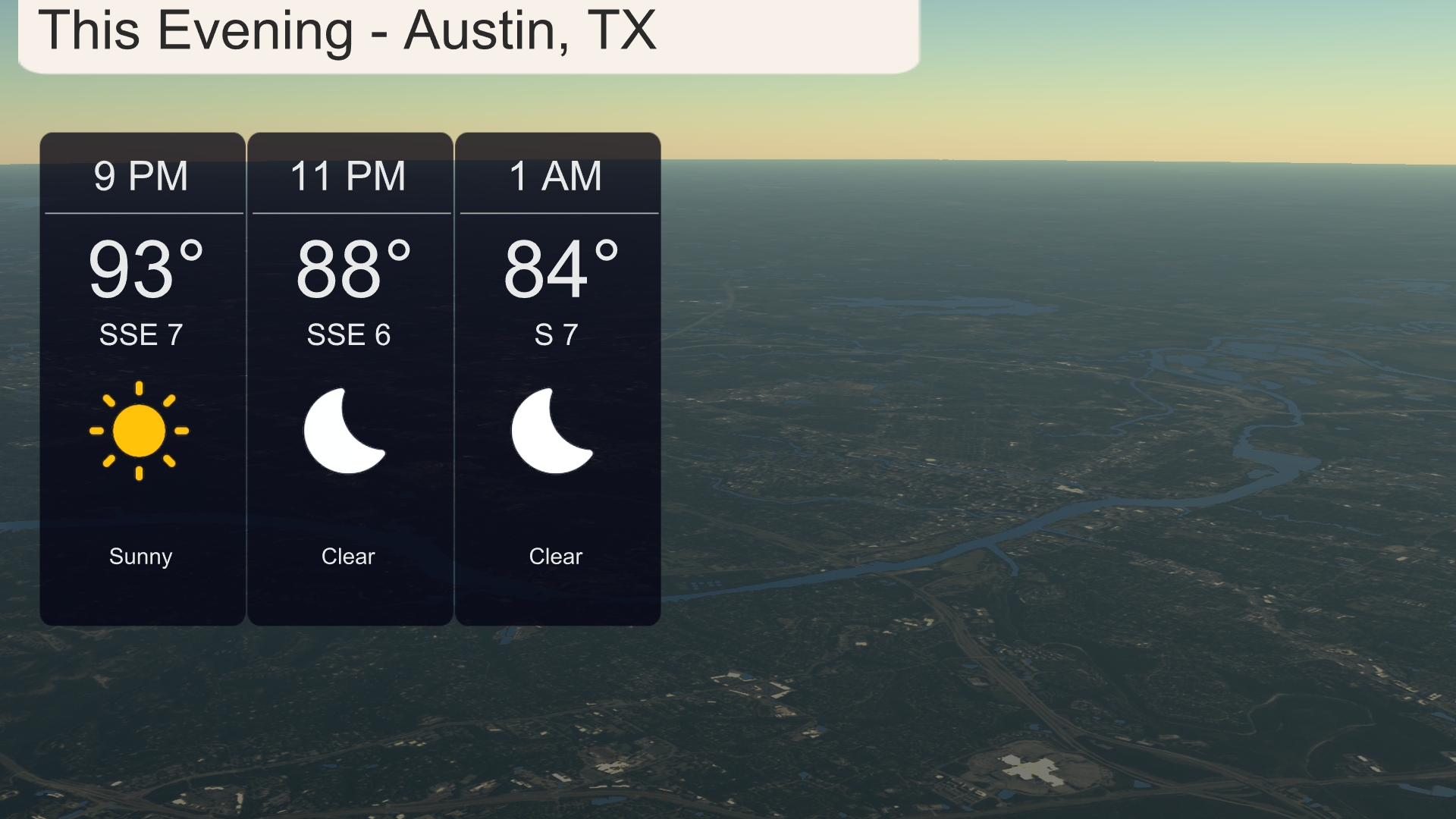 This evening in Austin, temperatures will start at 93 degrees at 9 PM, gradually cooling to 84 degrees by 1 AM. Expect clear skies throughout the night. Winds will be coming from the south-southeast at 7 miles per hour, then slowing slightly to 7 miles per hour from the south by 1 AM. Enjoy a calm and clear evening under Texas skies.