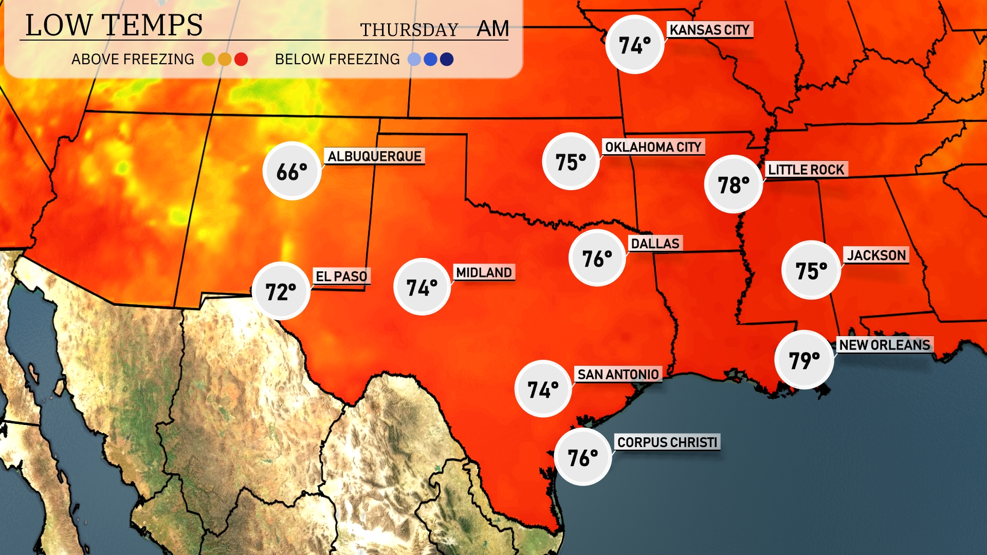 Tonight in the Southern Plains, temperatures will dip to 72 degrees in El Paso and 74 in Midland. Dallas is forecasted for a low of 76 degrees, while San Antonio can expect a comfortable 74. Jackson will also see a low of 75 degrees, while New Orleans stays mild at 79 degrees. With these temperatures, residents can anticipate a warm night ahead.