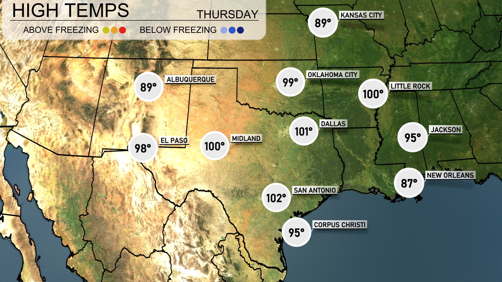 Tomorrow in the Southern Plains, temperatures will be heating up significantly. Dallas will see a high of 100 degrees, while Midland will also reach 100. San Antonio is expected to hit a sizzling 102 degrees. Over in El Paso, temperatures will climb to 98 degrees, which is slightly above the average for this time of year. Expect mostly sunny skies, which will contribute to these elevated temperatures across the region.