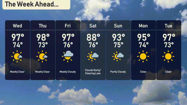 Here’s the 7-day forecast for Austin: Wednesday: Mostly clear skies with a high of 97 degrees and a low of 74 degrees. Thursday: Another mostly clear day, temperatures reaching up to 98 degrees, cooling down to 73 degrees at night. Friday: Expect mostly cloudy conditions with a high of 97 degrees and a low of 76 degrees. Saturday: Clouds earlier in the day, clearing out later. Highs around 88 degrees, with lows of 76 degrees. Sunday: Partly cloudy skies will prevail, with a high of 93 degrees and a low of 75 degrees. Monday: Clear and sunny, reaching a high temperature of 95 degrees and a low of 74 degrees. Tuesday: Another clear day on the horizon, with a high of 97 degrees and a low of 73 degrees. Enjoy your week and stay cool in the Austin heat!