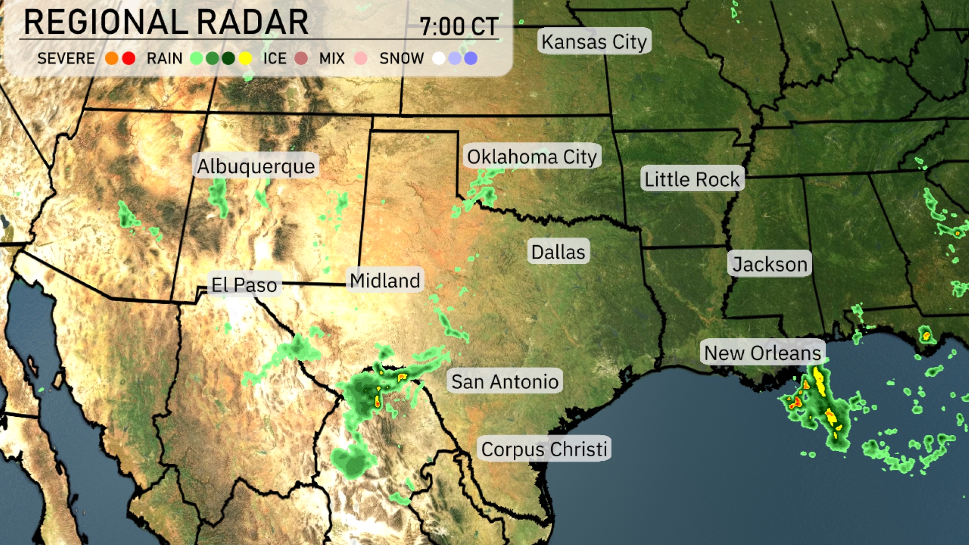Across the Southern Plains, the most dynamic weather activity is centered over the Gulf of Mexico near New Orleans, where thunderstorms are quite active, promising a wet start to the day. Scattered showers extend from western Texas near El Paso, up through Midland, suggesting spotty rain chances there. Similarly, light rain is present near San Antonio, moving eastward, though areas like Dallas and Oklahoma City enjoy drier conditions under partly cloudy skies. To the north, Kansas City remains clear, providing a calm and settled weather pattern for the day ahead.