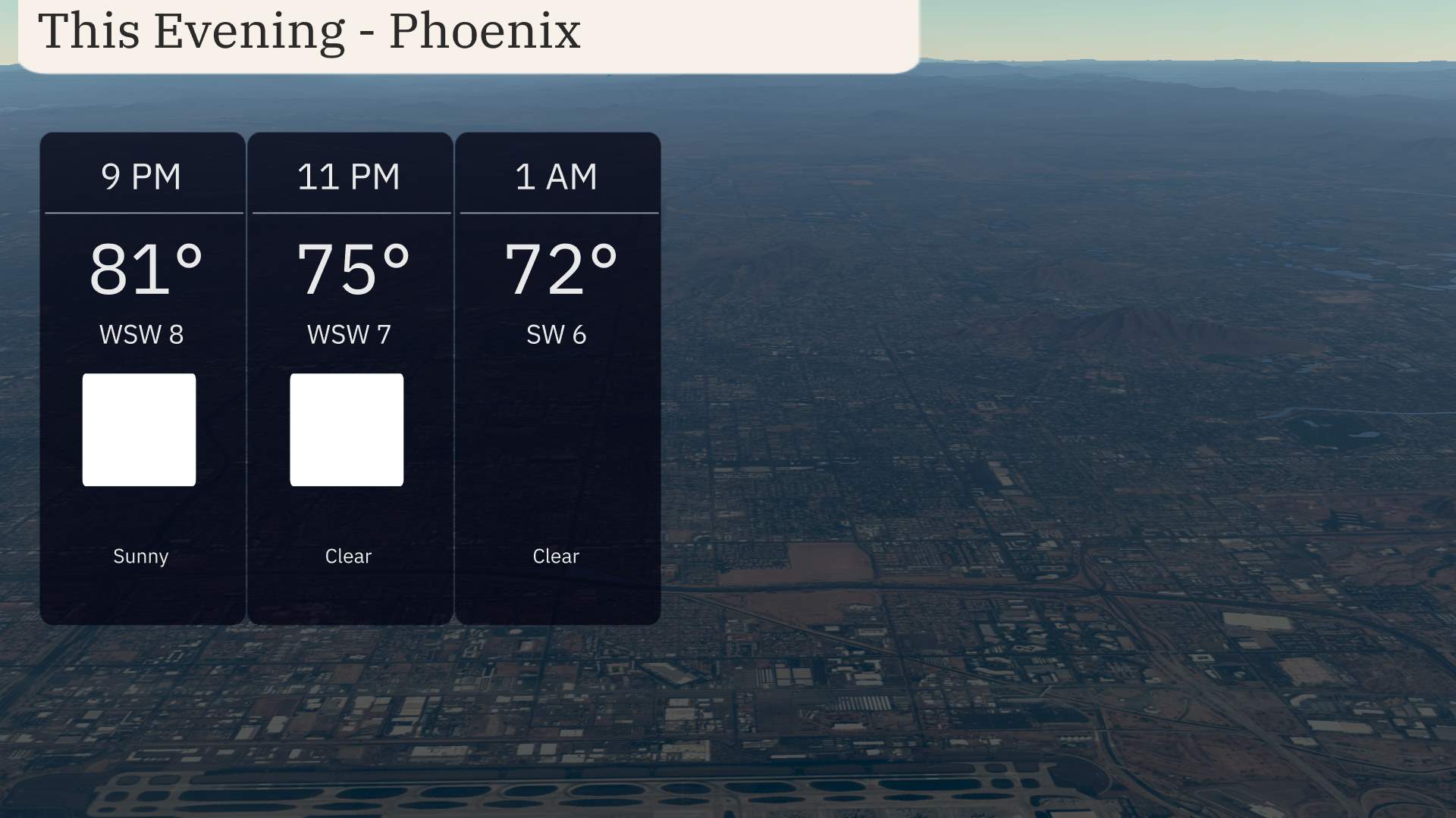 For this evening in Phoenix, anticipate mostly clear skies. Temperatures will begin at 81 degrees at 9 PM, descending to 72 degrees by 1 AM. Winds start from the west-southwest at 8 miles per hour, decreasing slightly to the southwest at 6 miles per hour as the night progresses.