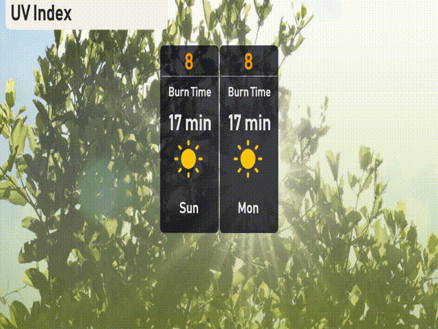 The UV index in Phoenix is rated at a very high 8 for both Sunday and Monday, leading to a burn time of just 17 minutes in direct sunlight.