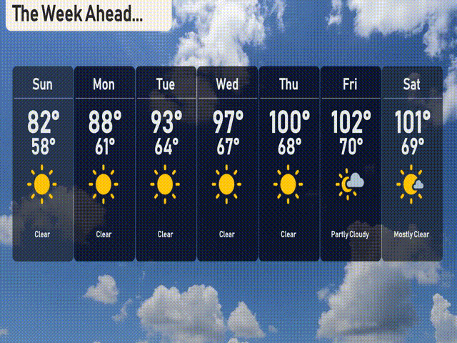 Thursday: Clear skies persist, reaching up to 100 degrees during the day, with a nighttime low of 68.