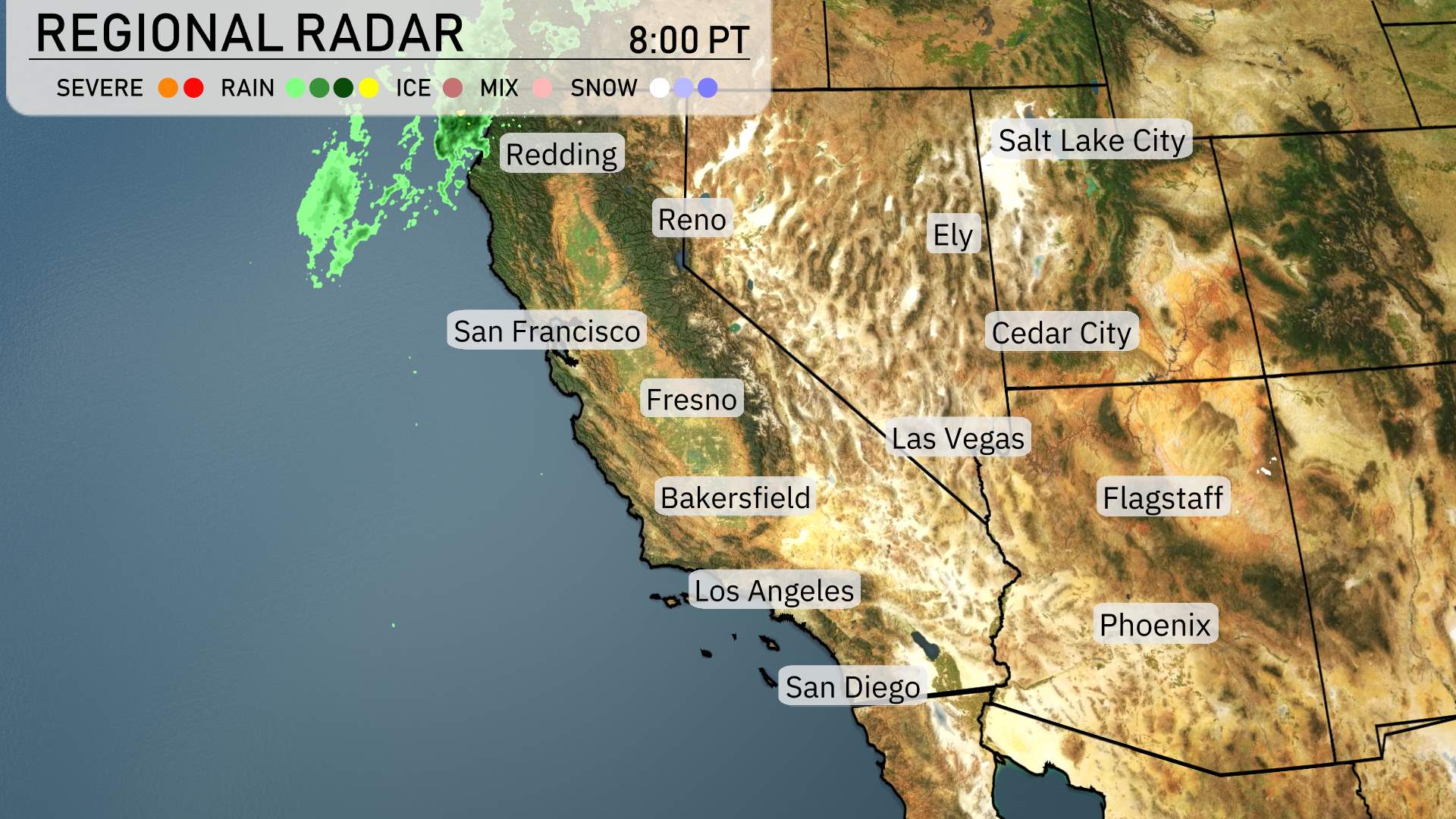 A swath of rain showers is making its way over the Pacific, affecting the Northern California coastline around Redding. As this system moves inland, we anticipate precipitation to reach areas farther east, including the Sierra Nevada, where higher elevations could receive snowfall. Reno is staying dry for now.